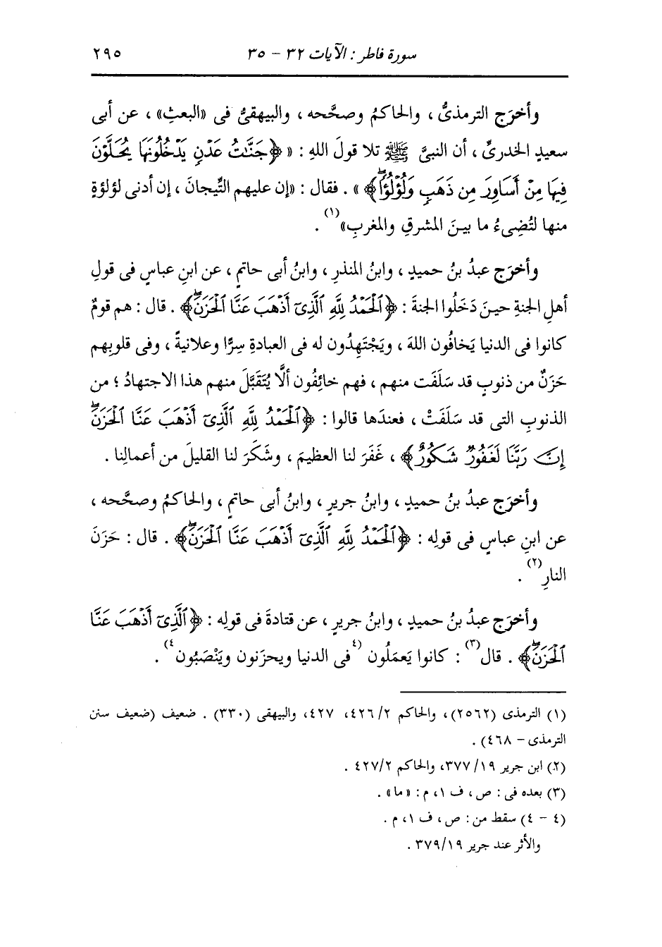 الحارث أن ابن عباس سأل كعبا عن قوله {ثم أورثنا الكتاب الذين اصطفينا من عبادنا} ، نجوا كلهم ثم قال : تحاكت مناكبهم ورب الكعبة ثم أعطوا الفضل بأعمالهم.