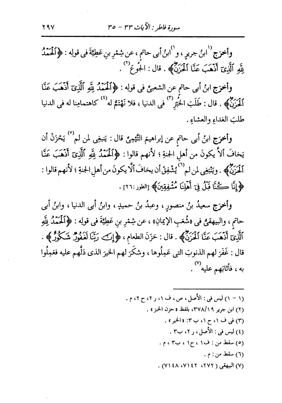 وأخرج ابن المنذر عن شمر بن عطية رضي الله عنه قال : قال رسول الله صلى الله عليه وسلم حيث دخلوا الجنة {وقالوا الحمد لله الذي أذهب عنا الحزن} قال : حزنهم هو الحزن.