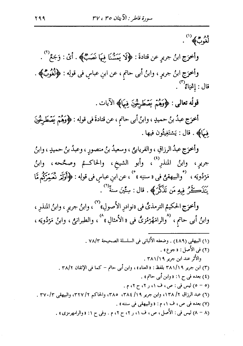 وأخرج عَبد بن حُمَيد ، وَابن جَرِير ، وَابن المنذر ، وَابن أبي حاتم عن قتادة رضي الله عنه في قوله {إن ربنا لغفور شكور} يقول {غفور} لذنوبهم {شكور} لحسناتهم {الذي أحلنا دار المقامة من فضله} قال : أقاموا فلا يتحولون ولا يحولون {لا يمسنا فيها نصب ولا يمسنا فيها لغوب} قال : قد كان القوم ينصبون في الدنيا في طاعة الله وهم قوم جهدهم الله قليلا ثم أراحهم كثيرا فهنيئا لهم.
