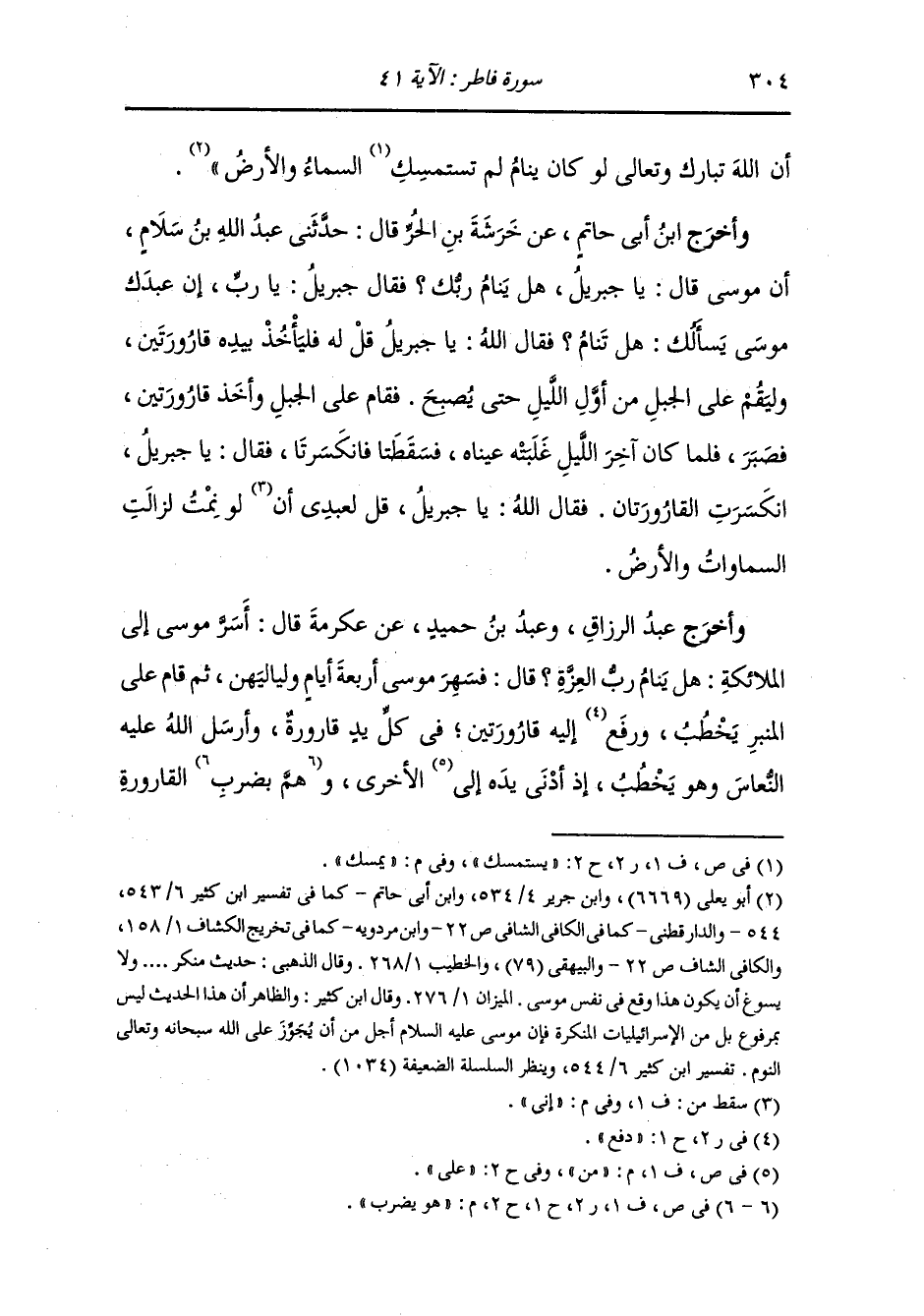 أَخرَج أبو يعلى ، وَابن جَرِير ، وَابن أبي حاتم والدارقطني في الأفراد ، وَابن مردويه والبيهقي في الأسماء والصفات والخطيب في تاريخه عن أبي هريرة رضي الله عنه قال : سمعت النَّبِيّ صلى الله عليه وسلم يقول : وقع في نفس موسى عليه السلام هل ينام الله عز وجل فأرسل الله ملكا إليه فارقه ثلاثا وأعطاه قارورتين في كل يد قارورة وأمره أن يتحفظ بهما فجعل ينام وتكاد يداه يلتقيان ثم يستيقظ فيحبس أحداهما عن الأخرى حتى نام نومة فاصطقت يداه وانكسرت القارورتان قال : ضرب الله له مثلا