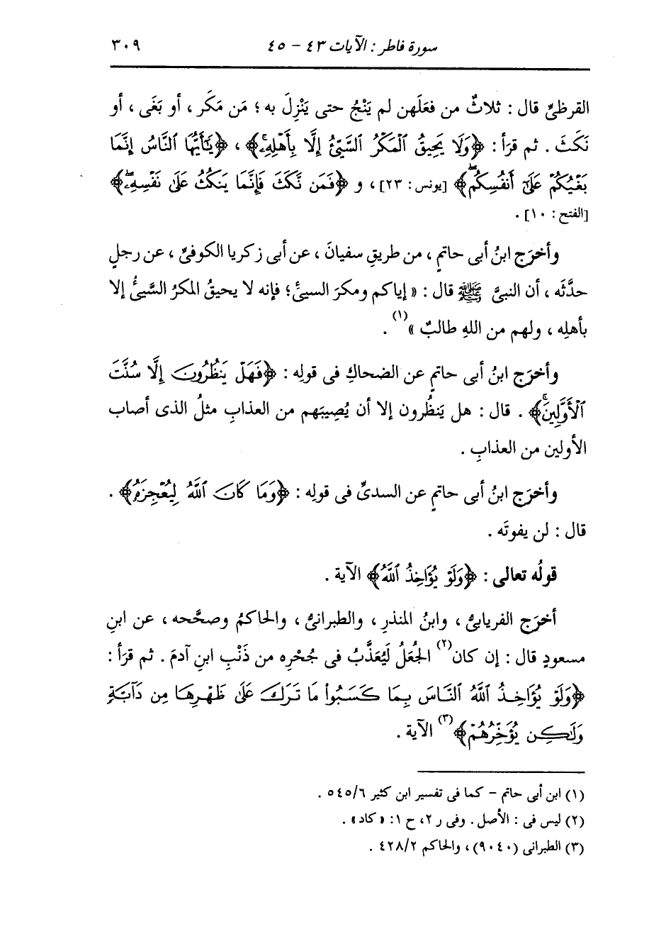 وأخرج عَبد بن حُمَيد ، وَابن جَرِير عن قتادة في قوله {فلما جاءهم نذير} قال : هو محمد صلى الله عليه وسلم {ما زادهم إلا نفورا استكبارا في الأرض ومكر السيء} وهو الشرك {ولا يحيق المكر السيء إلا بأهله} أي الشرك {فهل ينظرون إلا سنة الأولين} قال : عقوبة الأولين.