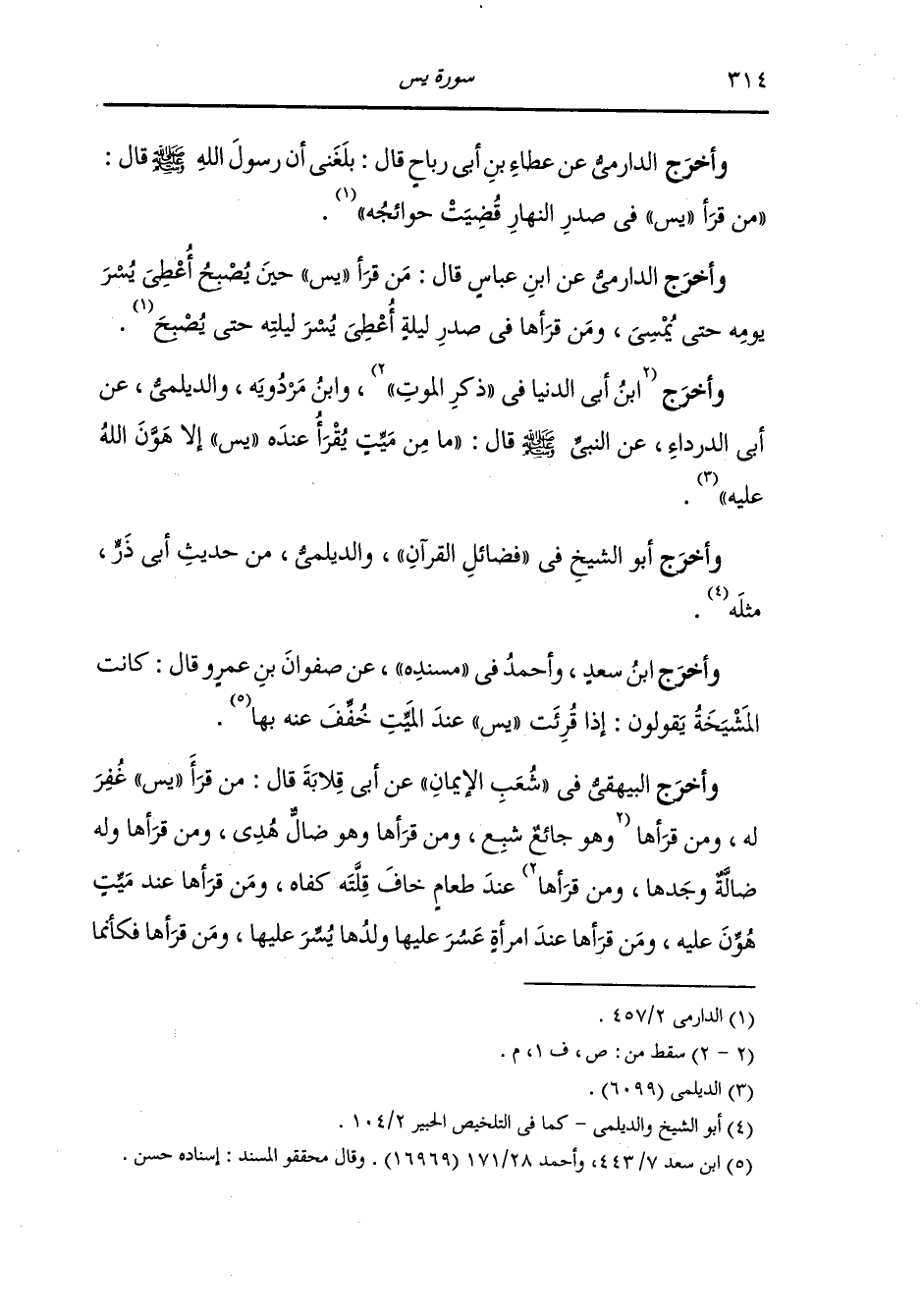 وأخرج ابن مردويه والبيهقي عن أبي عثمان النهدي قال أبو برزة : من قرأ (يس) مرة فكأنما قرأ القرآن عشر مرات وقال أبو سعيد : من قرأ (يس) مرة فكأنما قرأ القرآن مرتين قال أبو برزة : تحدث أنت بما سمعت وأحدث أنا بما سمعت.
