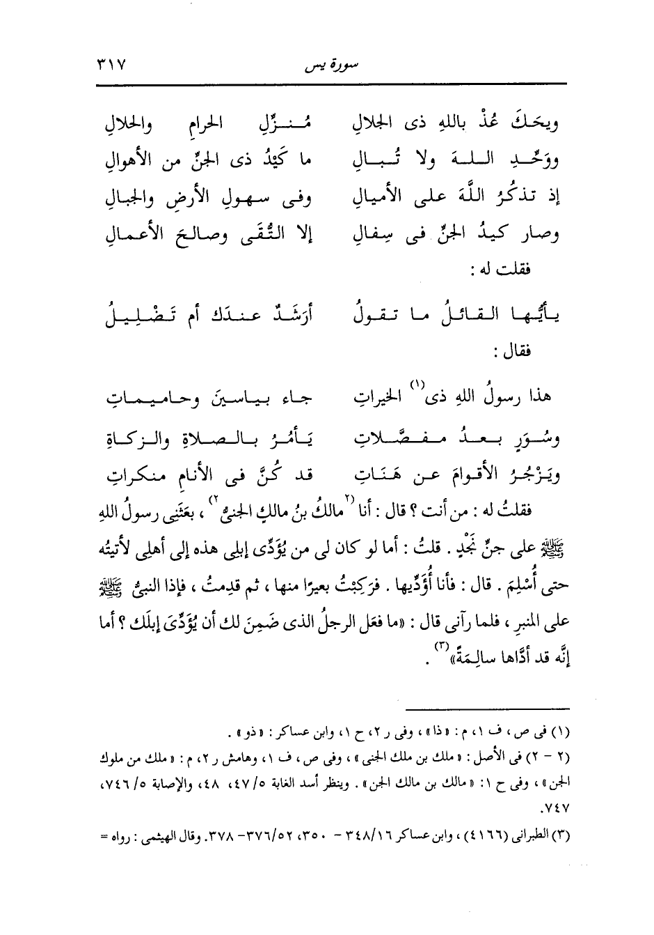 وَأخرَج أبو الشيخ في " العظمة" عن محمد بن سهل المقرىء عن أحمد بن عبيد الله بن محمد بن عمرو الدباغ عن أبيه قال : سلكت طريقا فيه غول فإذا امرأة عليها ثياب معصفرة على سرير وقناديل وهي تدعوني ، فلما رأيت ذلك أخذت في قرأءة "يس" فطفئت قناديلها ، وهي تقول : يا عبدالله ما صنعت بي ، ياعبدالله ما صنعت بي . منها . قال المقرىء : فلا يصيبكم شىء من خوف أو مطالبة من سلطان أو عدو إلا قرأتم "يس" فإنه يدفع عنكم بها ..