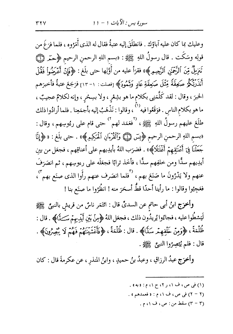 وأخرج ابن مردويه عن ابن عباس قال : اجتمعت قريش بباب النَّبِيّ صلى الله عليه وسلم ينتظرون خروجه ليؤذوه فشق ذلك عليه فأتاه جبريل بسورة {يس} وأمره بالخروج عليهم فأخذ كفا من تراب وخرج وهو يقرأوها ويذر التراب على رؤوسهم فما رأوه حتى جاز فجعل أحدهم يلمس رأسه فيجد التراب وجاء بعضهم فقال : ما يجلسكم قالوا : ننتظر محمدا فقال : لقد رأيته داخلا المسجد قالوا : قوموا فقد سحركم.