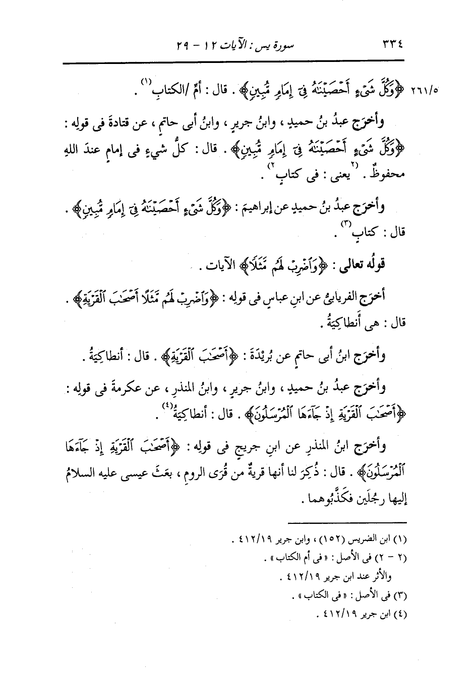 وأخرج ابن أبي حاتم عن جرير بن عبد الله البجلي قال : قال رسول الله صلى الله عليه وسلم : من سن سنة حسنة فله أجرها وأجر من عمل بها من بعده من غير أن ينقص من أجورهم شيء ومن سن سنة سيئة كان عليه وزرها ووزر من عمل بها من بعده لا ينقص من أوزارهم شيء ، ثم تلا هذه الآية {ونكتب ما قدموا وآثارهم}.