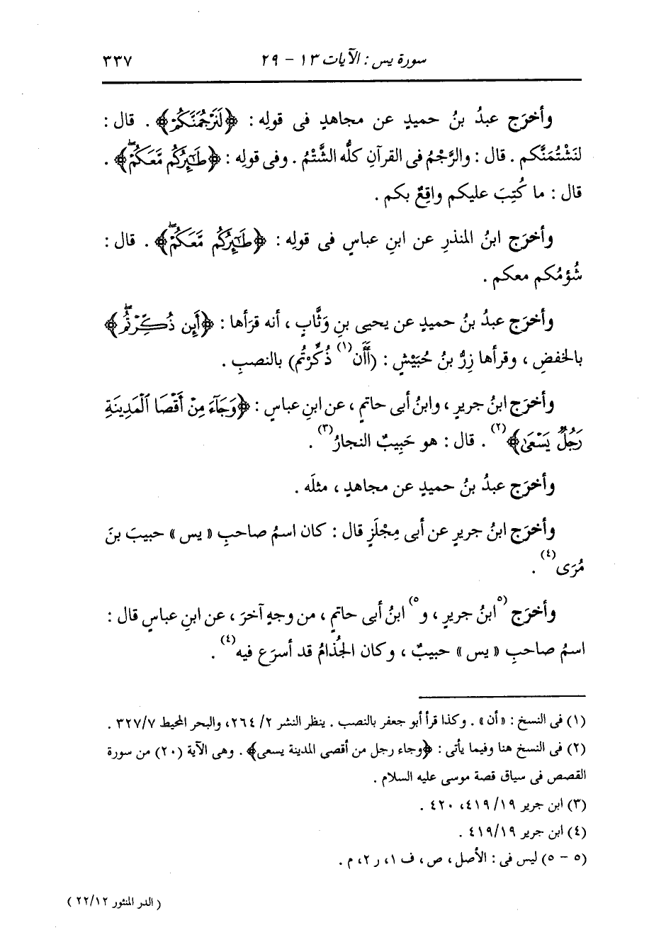 وأخرج ابن المنذر عن سعيد بن جبير رضي الله عنه في قوله {إذ أرسلنا إليهم اثنين} ، ، قال : اسم الثالث الذي عزز به سمعون بن يوحنا ، والثالث بولص فزعموا أن الثلاثة قتلوا جميعا وجاء حبيب وهو يكتم إيمانه {قال يا قوم اتبعوا المرسلين} فلما رأوه أعلن بإيمانه فقال {إني آمنت بربكم فاسمعون} وكان نجارا ألقوه في بئر وهي الرس وهم أصحاب الرس.