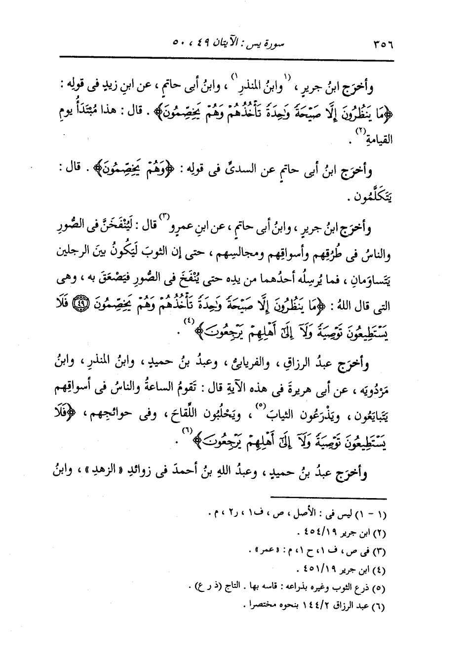 أَخرَج عَبد بن حميد ، وَابن جَرِير ، وَابن أبي حاتم عن قتادة رضي الله عنه في قوله {ما ينظرون إلا صيحة واحدة تأخذهم وهم يخصمون} قال : ذكر لنا أن نبي الله صلى الله عليه وسلم كان يقول : تهيج الساعة الناس والرجل يسقي ماشيته والرجل يصلح حوضه والرجل يقيم سلعته في سوقه والرجل يخفض ميزانه ويرفعه فتهيج بهم وهم كذلك {فلا يستطيعون توصية ولا إلى أهلهم يرجعون} قال : أعجلوا عن ذلك.