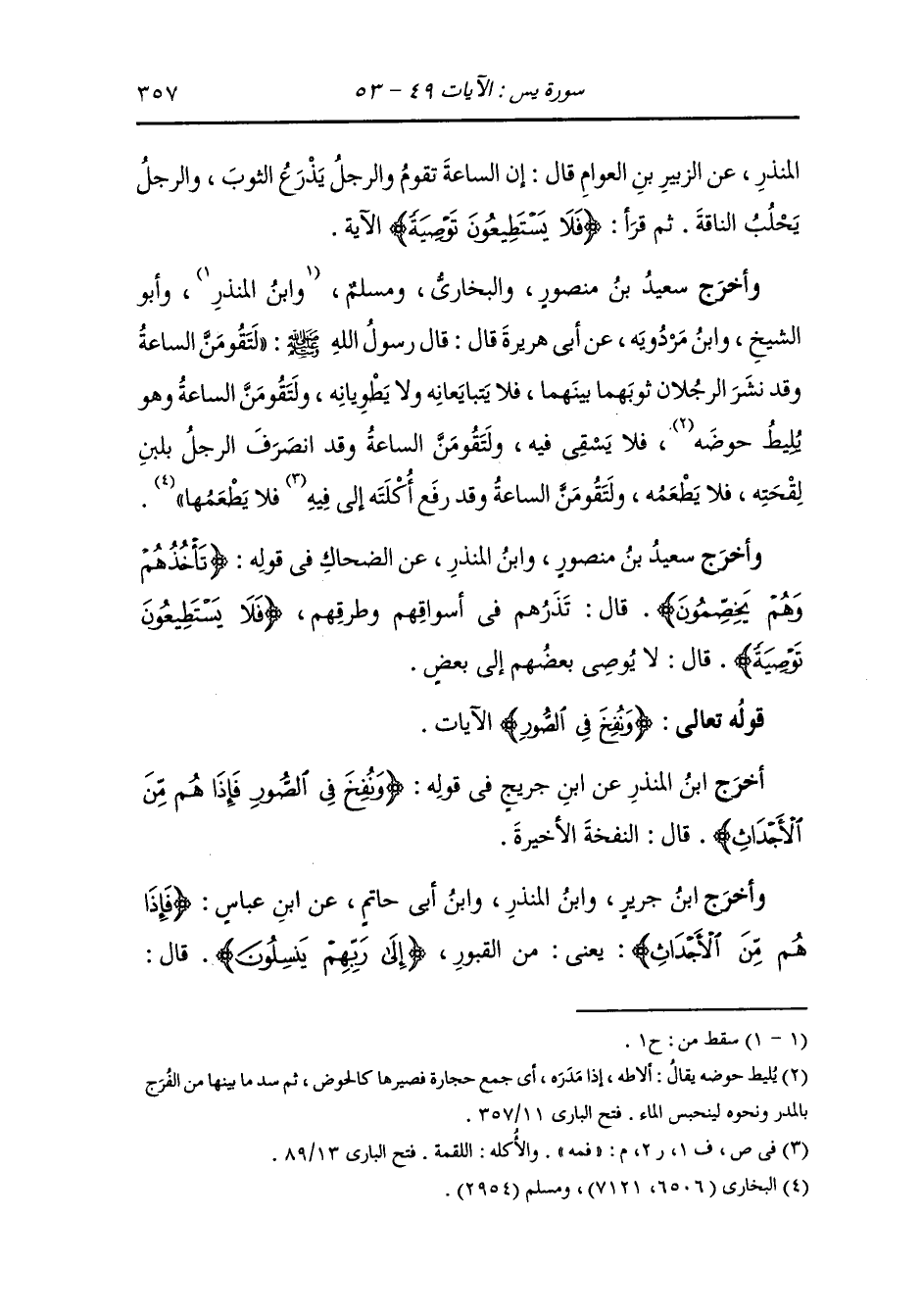 وأخرج ابن جرير ، وَابن أبي حاتم عن ابن عمر قال : لينفخن في الصور والناس في طرقهم وأسواقهم ومجالسهم حتى أن الثوب ليكون بين الرجلين يتساومان فما يرسله أحدهما من يده حتى ينفخ في الصور فيصعق به وهي التي قال الله {ما ينظرون إلا صيحة واحدة تأخذهم وهم يخصمون فلا يستطيعون توصية ولا إلى أهلهم يرجعون}.
