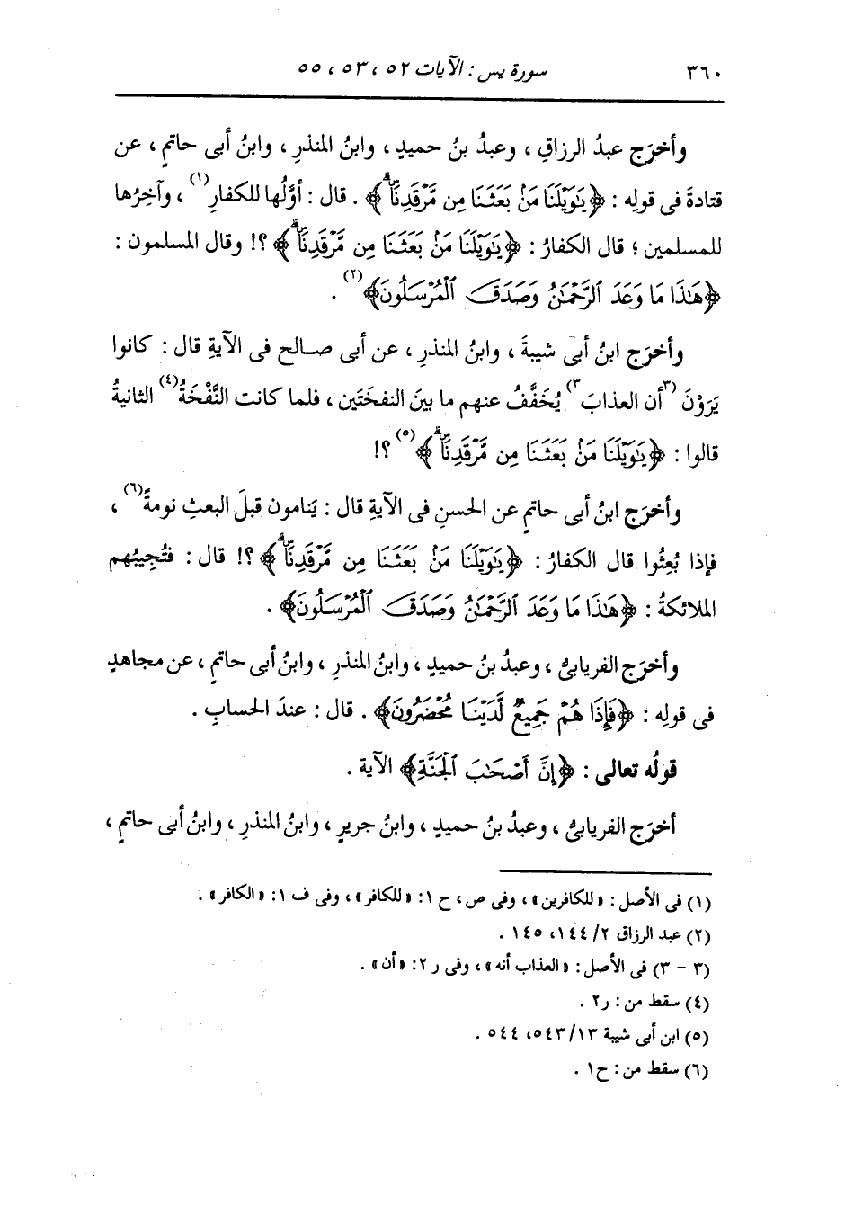 وأخرج الفريابي ، وعَبد بن حُمَيد ، وَابن جَرِير ، وَابن المنذر ، وَابن أبي حاتم عن أبي بن كعب رضي الله عنه في قوله {من بعثنا من مرقدنا} قال : ينامون قبل البعث نومة.