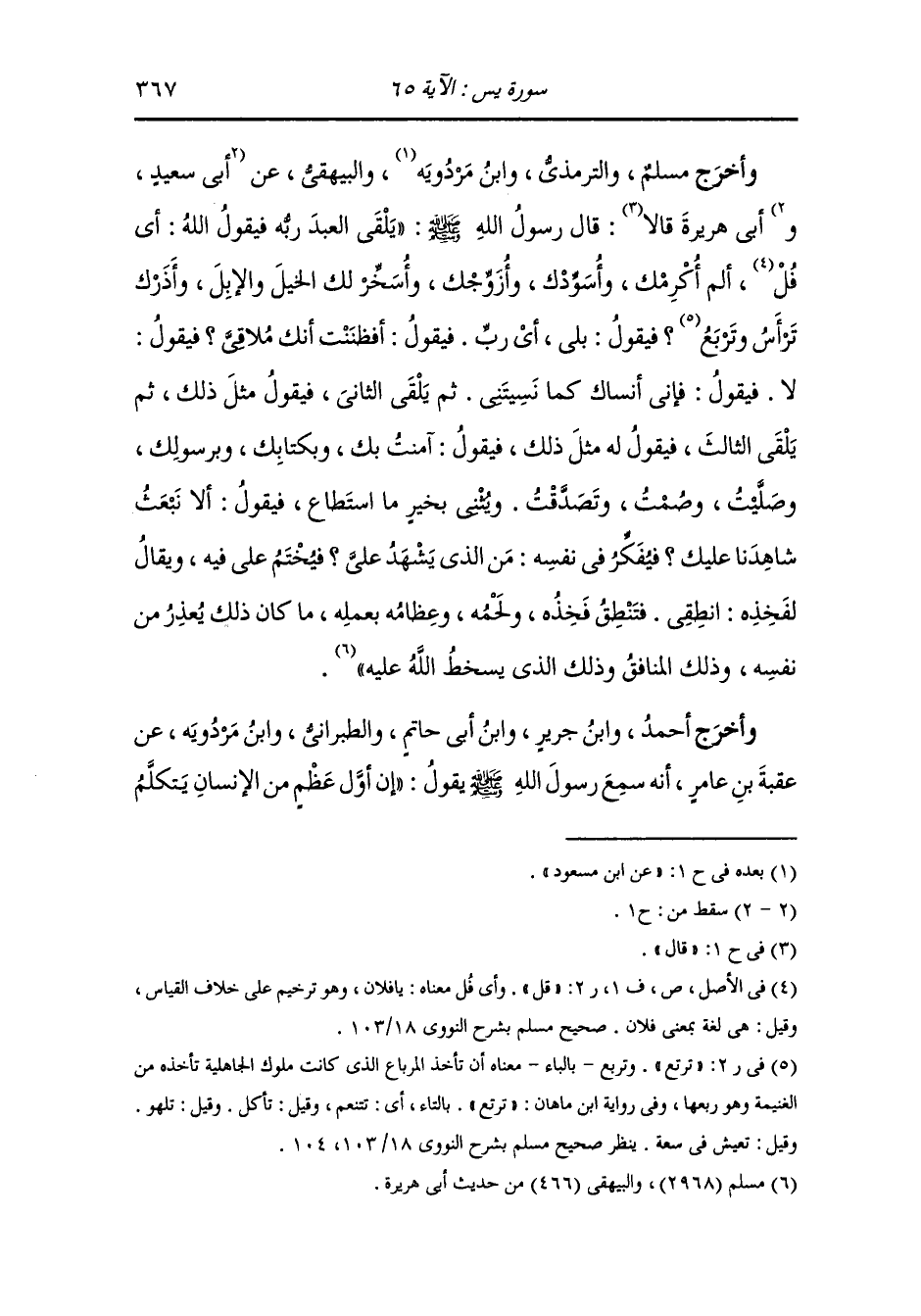 أَخرَج أحمد ومسلم والنسائي ، وَابن أبي الدنيا في التوبة واللفظ له ، وَابن أبي حاتم ، وَابن مردويه والبيهقي في الأسماء والصفات عن أنس رضي الله عنه في قوله {اليوم نختم على أفواههم} قال كنا عند النَّبِيّ صلى الله عليه وسلم فضحك حتى بدت نواجذه قال : أتدرون ممن ضحكت قلنا : لا يا رسول الله قال : من مخاطبة العبد ربه فيقول : يا رب ألم