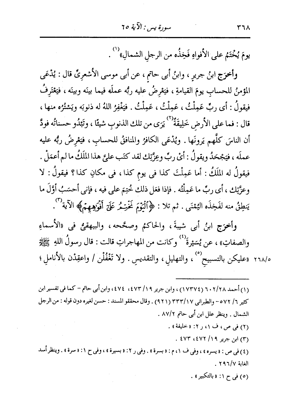 وأخرج مسلم والترمذي ، وَابن مردويه والبيهقي عن أبي سعيد وأبي هريرة قالا : قال رسول الله صلى الله عليه وسلم : يلقى العبد ربه فيقول الله : أي قل ألم أكرمك وأسودك وأزوجك وأسخر لك الخيل والإبل وأذرك ترأس وتربع فيقول : بلى أي رب فيقول : أفطنت أنك ملاقي فيقول : لا ، فيقول : فإني أنساك كما نسيتني ، ثم يلقى الثاني فيقول : مثل ذلك ، ثم يلقى الثالث فيقول له : مثل ذلك فيقول : آمنت بك وبكتابك وبرسولك وصليت وصمت وتصدقت ويثني بخير ما استطاع فيقول : ألا نبعث شاهدنا عليك فيفكر في نفسه من الذي يشهد علي فيختم على فيه ويقال لفخذه : انطقي ، فتنطق فخذه ولحمه وعظامه ، بعمله ما كان ذلك يعذر من نفسه وذلك بسخط الله عليه.