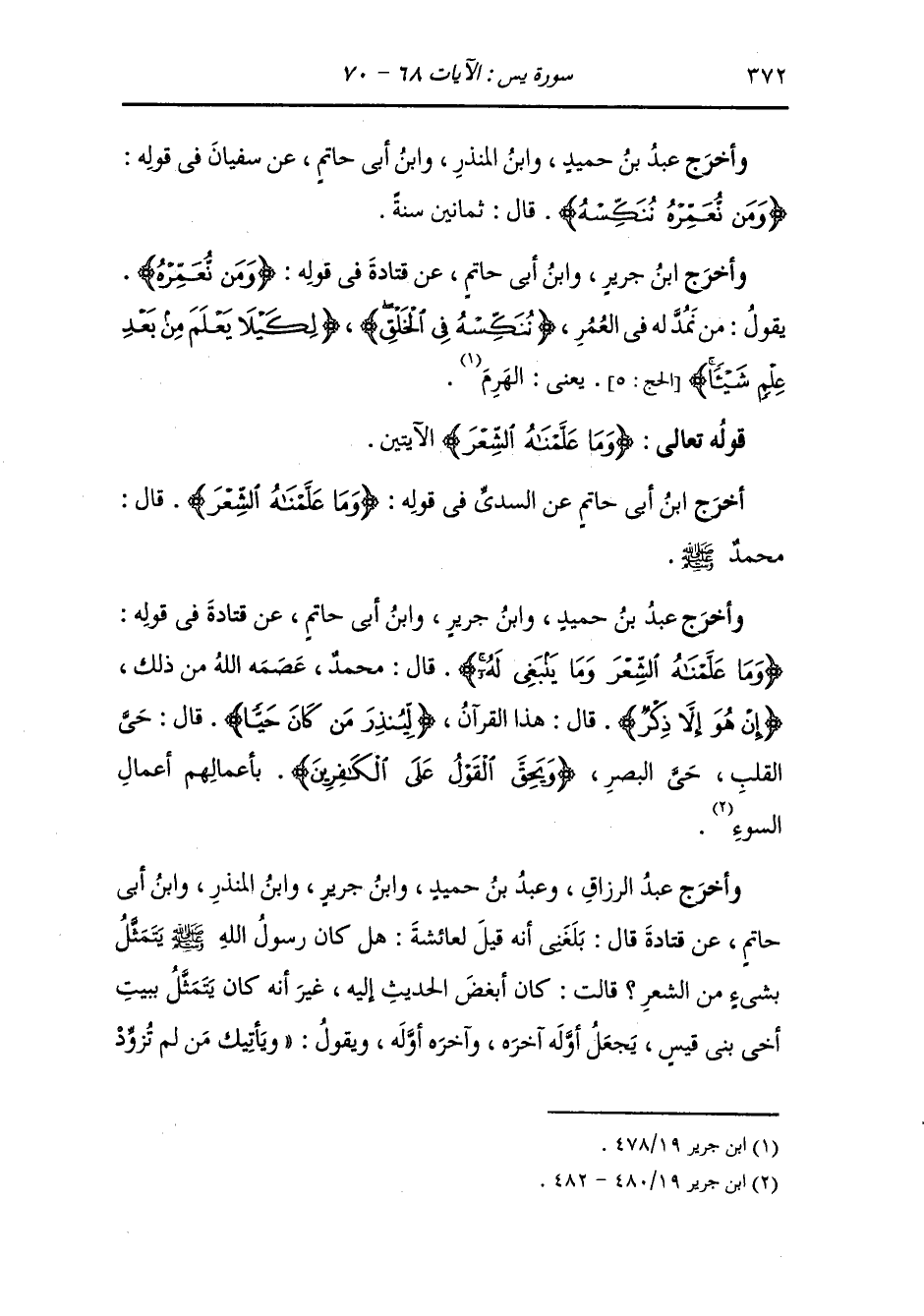 أخرج عبد الرزاق ، وعَبد بن حُمَيد ، وَابن المنذر ، وَابن أبي حاتم عن قتادة في قوله {ومن نعمره ننكسه في الخلق} قال : هو الهرم ، يتغير سمعه وبصره وقوته كما رأيت.
