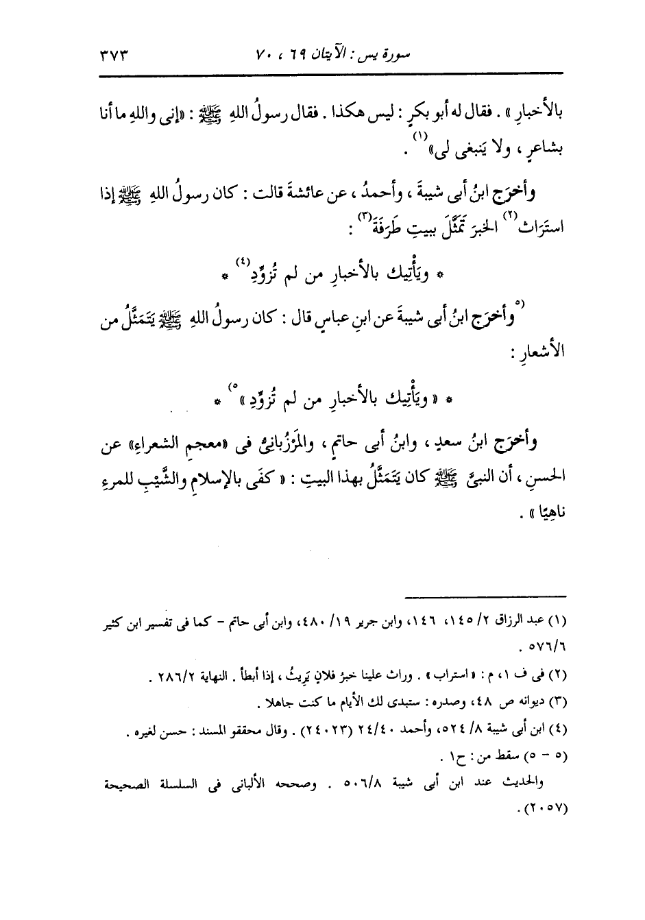 وأخرج عبد الرزاق ، وعَبد بن حُمَيد ، وَابن جَرِير ، وَابن المنذر ، وَابن أبي حاتم عن قتادة رضي الله عنه قال : بلغني أنه قيل لعائشة رضي الله عنها هل كان رسول الله صلى الله عليه وسلم يتمثل بشيء من الشعر قالت : كان أبغض الحديث إليه غير أنه كان يتمثل ببيت أخي بني قيس يجعل أخره أوله وأوله آخره ويقول : ويأتيك من لم تزود