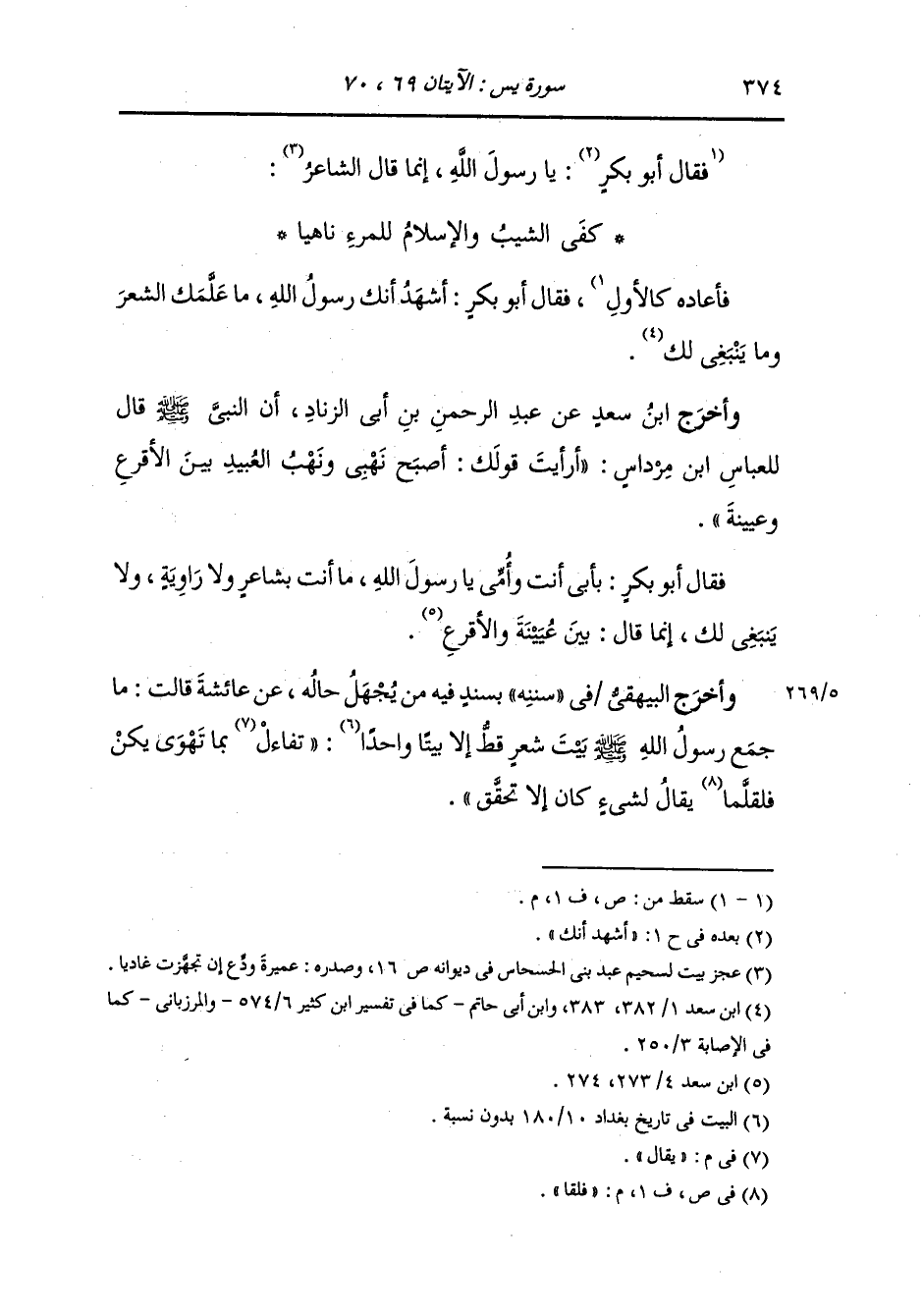 بالأخبار فقال له أبو بكر رضي الله عنه : ليس هكذا فقال رسول الله صلى الله عليه وسلم : إني والله ما أنا بشاعر ولا ينبغي لي.