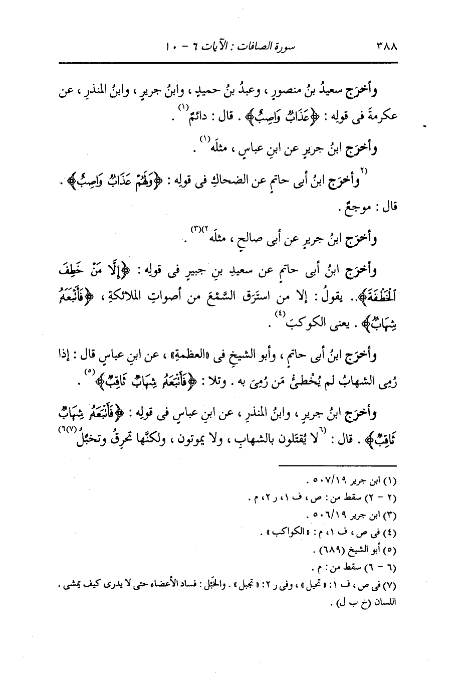 وأخرج عَبد بن حُمَيد ، وَابن جَرِير عن قتادة رضي الله عنه {ويقذفون من كل جانب دحورا} قال : قذفا بالشهب {ولهم عذاب واصب} قال : دائم.