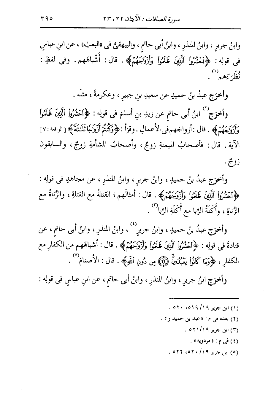 أَخْرَج ابن أبي حاتم عن ابن عباس رضي الله عنهما في قوله {احشروا الذين ظلموا وأزواجهم} قال : تقول الملائكة للزبانية {احشروا الذين ظلموا وأزواجهم}.