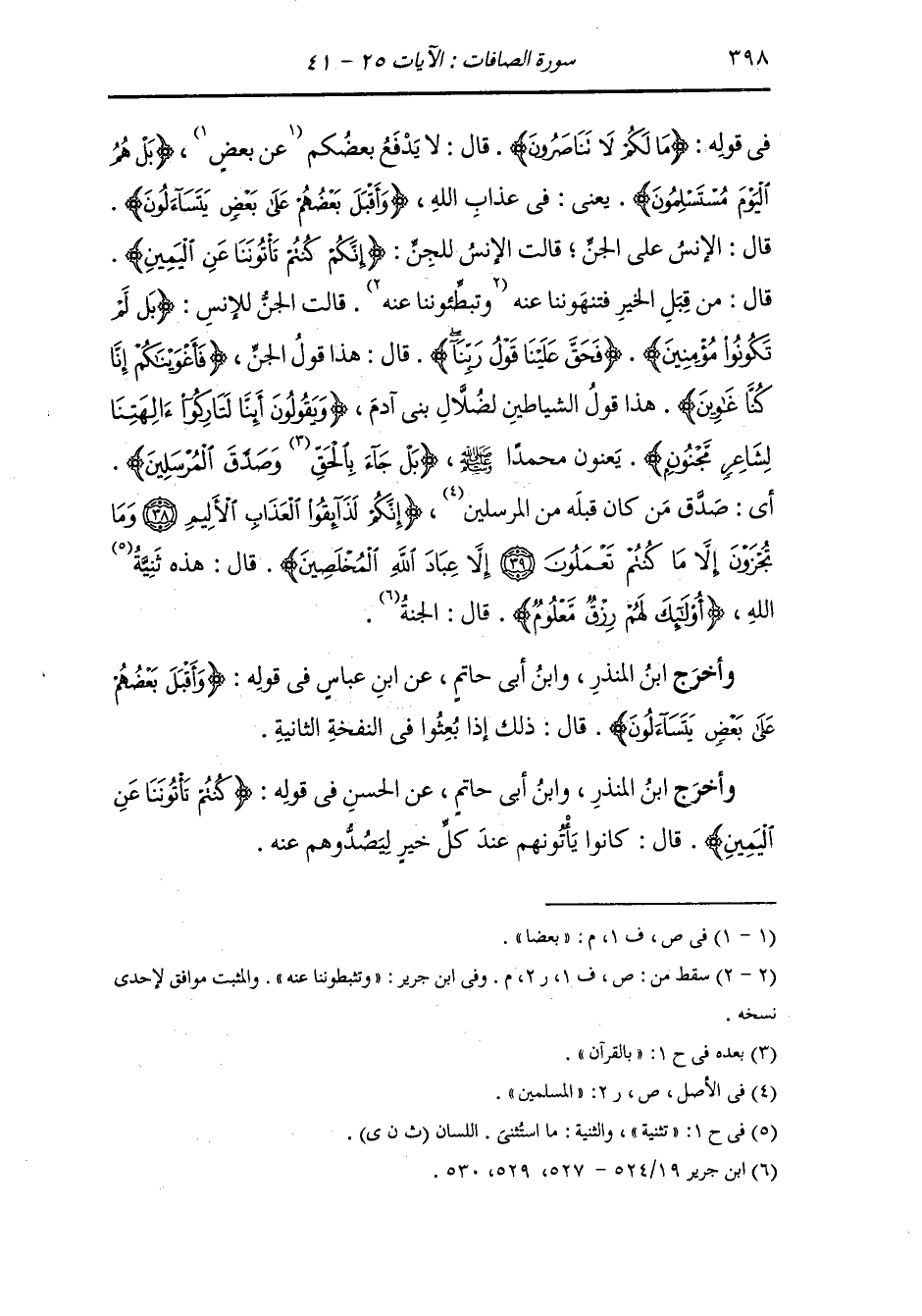 أَخْرَج ابن جرير عن ابن عباس رضي الله عنهما في قوله {ما لكم لا تناصرون} قال : لا تمانعون منا {بل هم اليوم مستسلمون} مسخرون {وأقبل بعضهم على بعض يتساءلون} أقبل بعضهم يلوم بعضا قال : الضعفاء للذين استكبروا {إنكم كنتم تأتوننا عن اليمين} تقهروننا بالقدرة عليكم {قالوا بل لم تكونوا مؤمنين} في علم الله {وما كان لنا عليكم من سلطان بل كنتم قوما طاغين} مشركين في علم الله {فحق علينا قول ربنا} فوجب علينا قضاء ربنا لأنا كنا أذلاء وكنتم أعزة {فإنهم يومئذ} قال : كلهم {في العذاب مشتركون}.