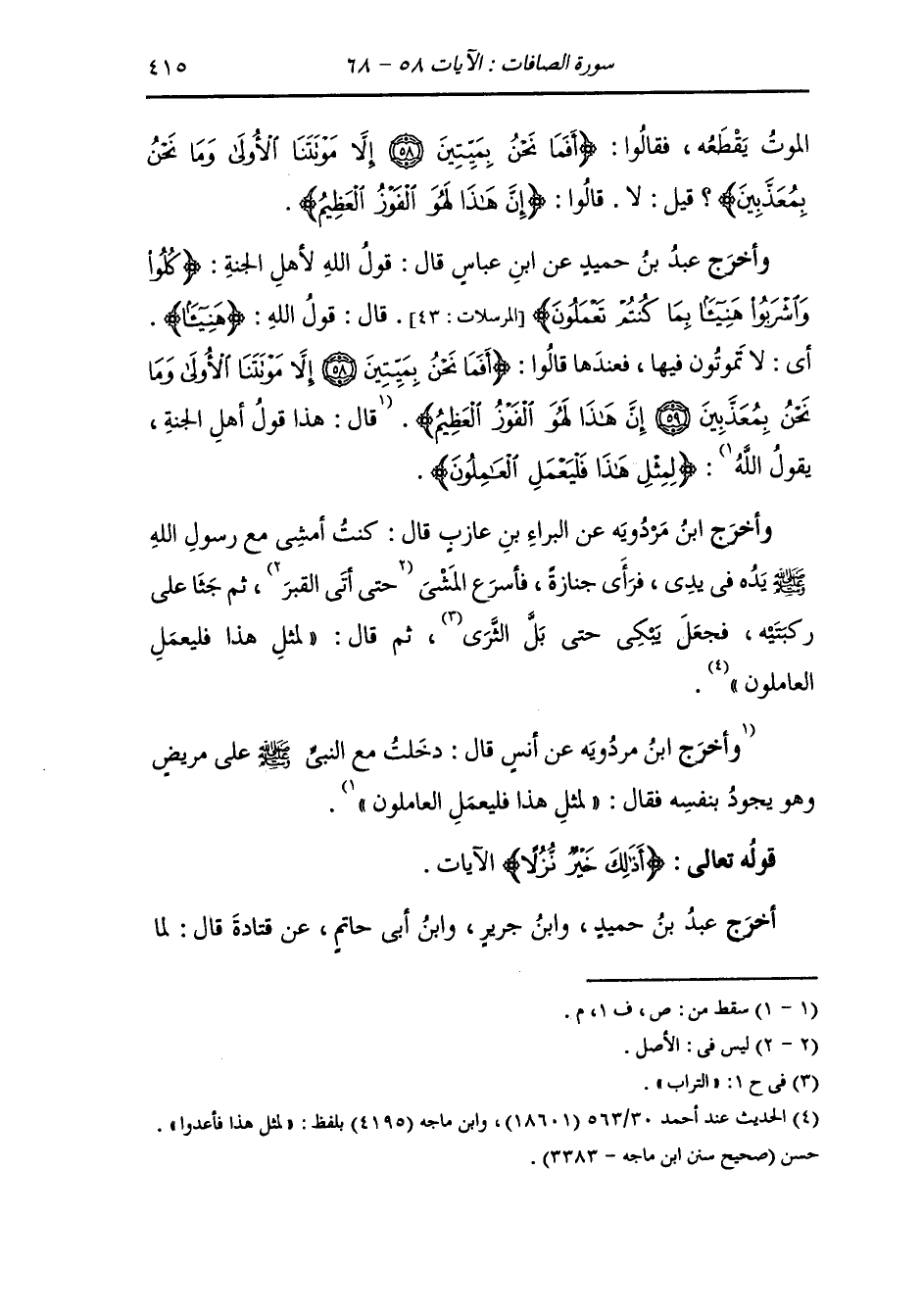وأخرج عبد الرزاق ، وعَبد بن حُمَيد ، وَابن جَرِير ، وَابن المنذر ، وَابن أبي حاتم عن قتادة رضي الله عنه في قوله {هل أنتم مطلعون} قال : سأل ربه أن يطلعه {فاطلع فرآه في سواء الجحيم} يقول : في وسطها فرأى جماجمهم تغلي فقال : فلان ، فلولا أن الله عرفه إياه لما عرفه ، لقد تغير خبره وسبره ، فعند ذلك قال {تالله إن كدت لتردين} يقول : لتهلكني لو أطعتك {ولولا نعمة ربي لكنت من المحضرين} قال : في النار {أفما نحن بميتين} إلى قوله {الفوز العظيم} قال : هذا قول أهل الجنة يقول الله {لمثل هذا فليعمل العاملون}.
