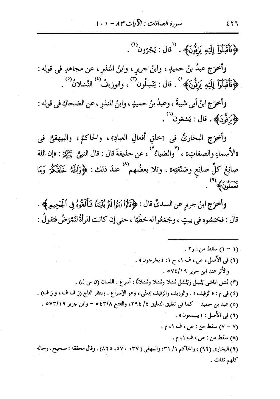 وأخرج عَبد بن حُمَيد ، وَابن جَرِير ، وَابن المنذر ، وَابن أبي حاتم عن قتادة في قوله {فتولوا عنه مدبرين} قال : فنكصوا عنه منطلقين {فراغ} قال : فمال {إلى آلهتهم فقال ألا تأكلون} يستنطقهم منطلقين {ما لكم لا تنطقون فراغ عليهم ضربا باليمين} أي فأقبل عليهن فكسرهن {فأقبلوا إليه يزفون} قال : يسعون {قال أتعبدون ما تنحتون} من الأصنام {والله خلقكم وما تعملون} قال : خلقكم وخلق ما تعملون بأيديكم {فأرادوا به كيدا فجعلناهم الأسفلين} قال : فما ناظرهم الله بعد ذلك حتى أهلكهم {وقال إني ذاهب إلى ربي} قال : ذاهب بعمله وقلبه ونيته.