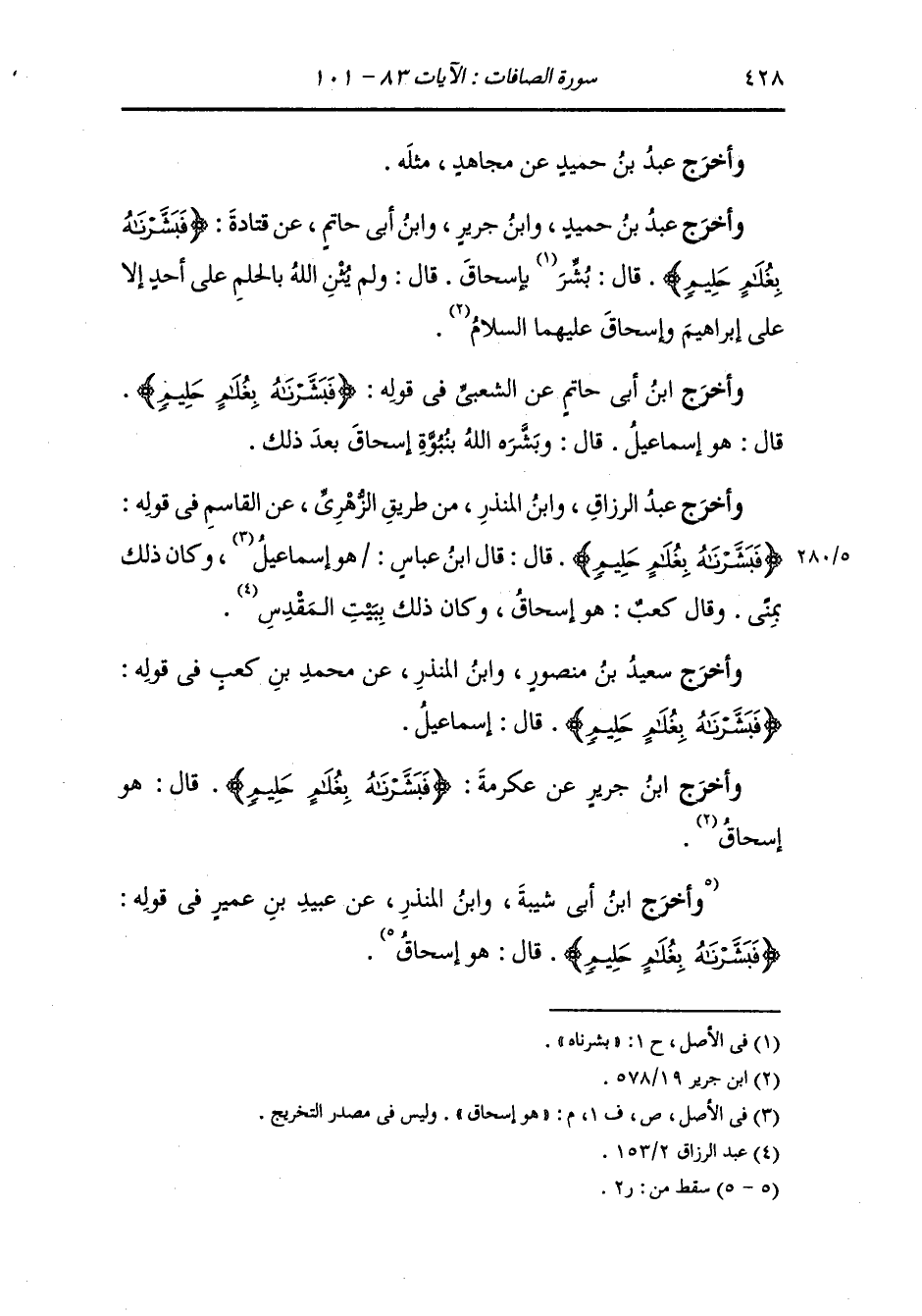 وأخرج عَبد بن حُمَيد ، وَابن أبي حاتم عن الحسن في قوله {فبشرناه بغلام حليم} قال : بولادة إسحاق عليه السلام.