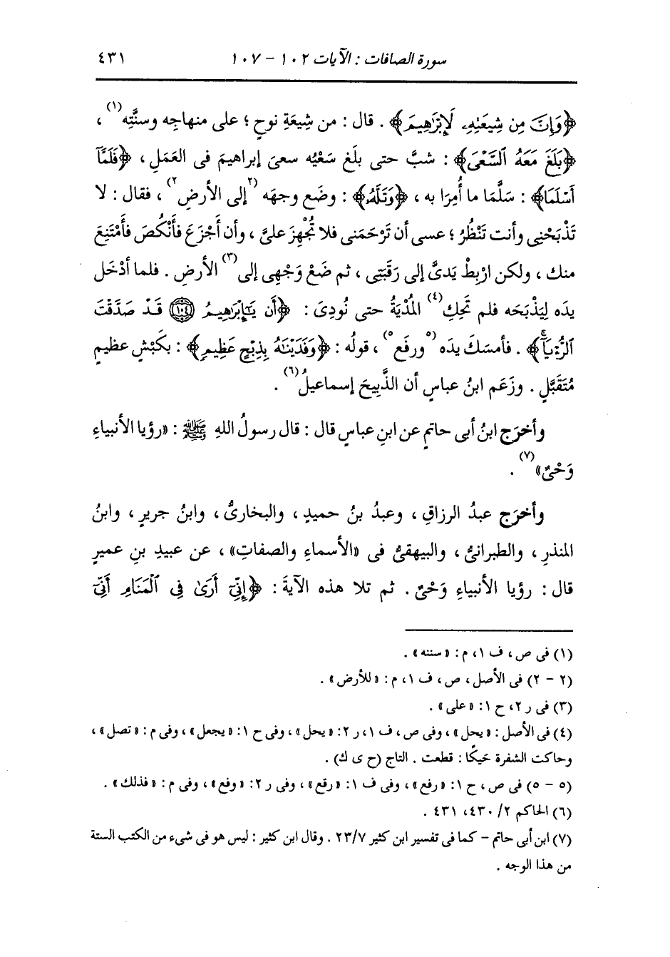 وأخرج الطبراني عن ابن عباس رضي الله عنهما قال : لما أراد إبراهيم عليه السلام أن يذبح إسحاق قال لأبيه : إذا ذبحتني فاعتزل لا أضطرب فينتضح عليك دمي فشده فلما أخذ الشفرة وأراد أن يذبحه نودي من خلفه {أن يا إبراهيم قد صدقت الرؤيا}.