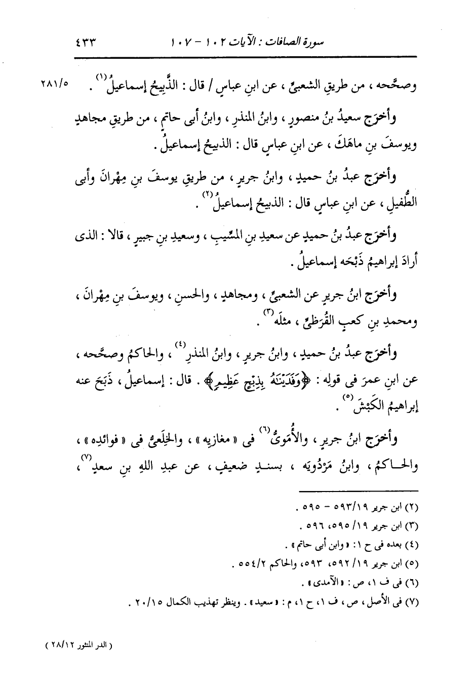 وأخرج أحمد ، وَابن جَرِير ، وَابن أبي حاتم والطبراني ، وَابن مردويه والبيهقي في شعب الإيمان عن ابن عباس رضي الله عنهما قال : لما أمر إبراهيم عليه السلام بالمناسك عرض له الشيطان عند المسعى فسابقه فسبقه إبراهيم عليه السلام ثم ذهب به جبريل عليه السلام إلى جمرة العقبة فعرض له الشيطان فرماه بسبع حصيات حتى ذهب ثم عرض له عند الجمرة الوسطى فرماه بسبع حصيات {وتله للجبين} وعلى إسماعيل عليه السلام قميص أبيض فقال : يا أبت ليس لي ثوب تكفني فيه غيره فأخلعه حتى تكفني فيه فعالجه ليخلعه فنودي من خلفه {أن يا إبراهيم قد صدقت الرؤيا} فالتفت فإذا كبش أبيض أعين أقرن فذبحه.