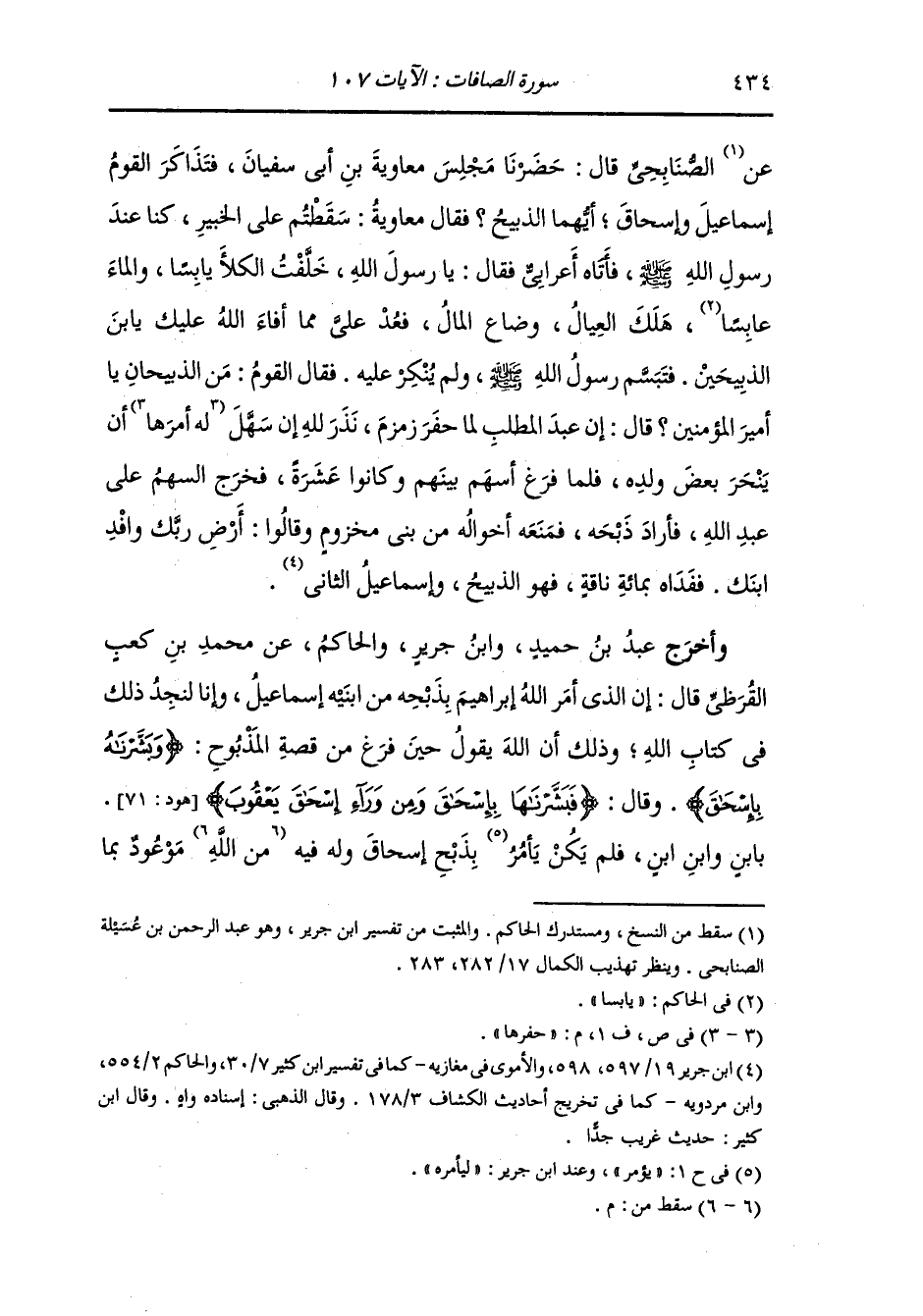 وأخرج عَبد بن حُمَيد ، وَابن جَرِير ، وَابن المنذر والحاكم وصححه عن ابن عمر رضي الله عنهما في قوله {وفديناه بذبح عظيم} قال : إسماعيل ذبح عنه إبراهيم الكبش.