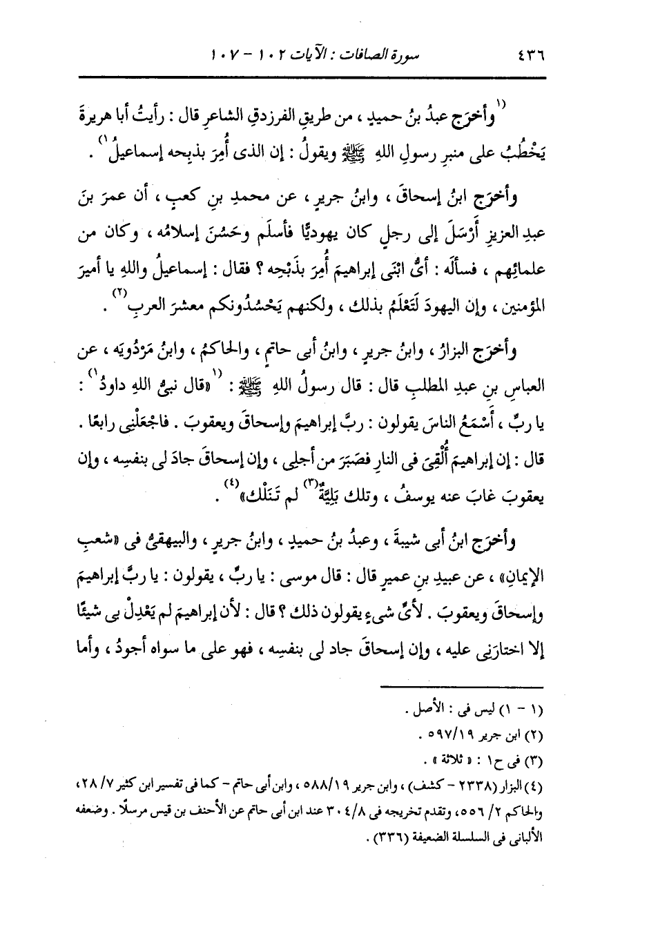 وأخرج الحاكم بسند فيه الواقدي عن عطاء بن يسار رضي الله عنه قال سألت خوات بن جبير رضي الله عنه عن ذبيح الله قال : إسماعيل عليه السلام لما بلغ سبع سنين رأى إبراهيم عليه السلام في النوم في منزله بالشام أن يذبحه فركب إليه على البراق حتى جاءه فوجده عند أمه فأخذ بيديه ومضى به لما أمر به وجاء الشيطان في صورة رجل يعرفه فذبح طرفي حلقه فإذا هو نحر في نحاس فشحذ الشفرة مرتين أو ثلاثا بالحجر ولا تحز قال إبراهيم : إن هذا الأمر من الله فرفع رأسه فإذا هو بوعل واقف بين يديه فقال إبراهيم : قم يا بني قد نزل فداؤك فذبحه هناك بمنى.