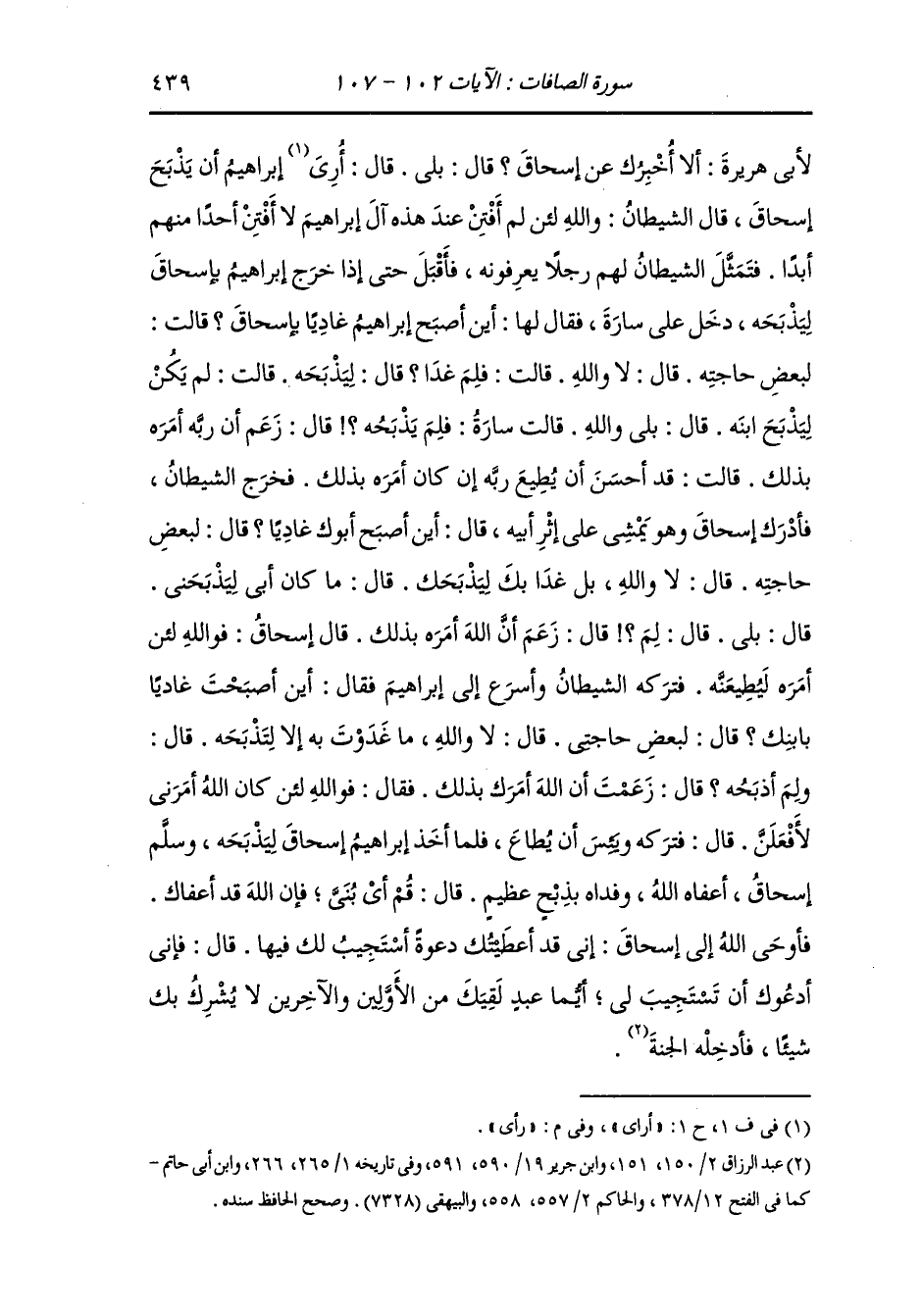 وأخرج ابن أبي حاتم والطبراني في الأوسط بسند ضعيف عن أبي هريرة رضي الله عنه قال : قال رسول الله صلى الله عليه وسلم : إن الله خيرني بين أن يغفر لنصف أمتي أو شفاعتي فاخترت شفاعتي ورجوت أن تكون أعم لأمتي ولولا الذي سبقني إليه العبد الصالح لعجلت دعوتي إن الله لما فرج عن إسحاق كرب الذبح قيل له : يا ابا إسحاق سل تعطيه قال : أما والله لا تعجلها قبل نزغات الشيطان اللهم من مات لا يشرك بك شيئا قد أحسن فأغفر له.