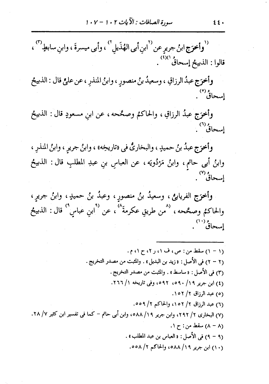 لأبي هريرة : ألا أخبرك عن إسحاق قال : بلى ، قال : رأى إبراهيم أن يذبح إسحاق قال الشيطان : والله لئن لم أفتن عند هذه آل إبراهيم لا أفتن أحدا منهم أبدا فتمثل الشيطان رجلا يعرفونه فأقبل حتى خرج إبراهيم بإسحاق ليذبحه دخل على سارة فقال : أين أصبح إبراهيم غاديا بإسحاق قالت : لبعض حاجته قال : لا والله قالت : فلم غدا قال : ليذبحه قالت : لم يكن ليذبح ابنه قال : بلى والله قالت سارة : فلم يذبحه قال : زعم أن ربه أمره بذلك قالت : قد أحسن أن يطيع ربه إن كان أمره بذلك ، فخرج الشيطان فأدرك إسحاق وهو يمشي على أثر أبيه قال : أين أصبح أبوك غاديا قال : لبعض حاجته قال : لا والله بل غدا بك ليذبحك قال : ما كان أبي ليذبحني قال : بلى قال : لم قال : زعم إن الله أمره بذلك قال إسحاق : فوالله لئن أمره ليطيعنه ، فتركه الشيطان وأسرع إلى إبراهيم فقال أين أصبحت غاديا بابنك قال : لبعض حاجتي قال : لا والله ما غدوت به إلا لتذبحه ، قال : ولم أذبحه قال : زعمت أن الله أمرك بذلك فقال : والله لئن كان الله أمرني لأفعلن ، قال فتركه ويئس أن يطاع فلما أخذ إبراهيم إسحاق ليذبحه وسلم إسحاق عافاه الله وفداه بذبح عظيم ، فقال : قم أي بني فإن الله قد عافاك فأوحى الله إلى إسحاق : إني قد