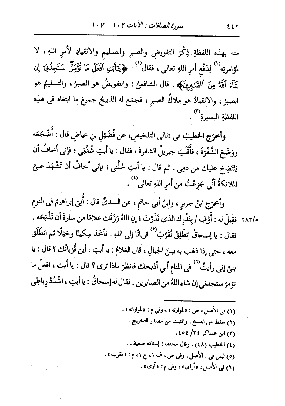 وأخرج ابن عساكر عن نوح بن حبيب قال : سمعت الشافعي يقول كلاما ما سمعت قط أحسن منه سمعته يقول : قال خليل الله إبراهيم لولده في وقت ما قص عليه ما رأى ماذا ترى أي ماذا تشير به ليستخرج