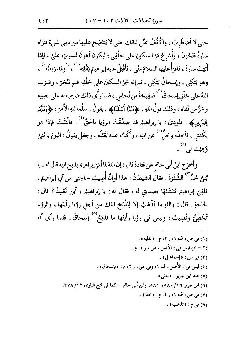 وَأخرَج ابن جرير ، وَابن أبي حاتم عن السدي رضي الله عنه قال : أتي إبراهيم في النوم فقيل له : أوف بنذرك الذي نذرت ، أن الله رزقك غلاما من سارة أن تذبحه ، فقال : يا إسحاق انطلق فقرب قربانا إلى الله فأخذ سكينا وحبلا ثم انطلق به حتى إذا ذهب به بين الجبال قال الغلام : يا أبت أين قربانك {قال يا بني إني أرى في المنام أني أذبحك فانظر ماذا ترى قال يا أبت افعل ما تؤمر ستجدني إن شاء الله من الصابرين} قال له إسحاق : يا أبت اشدد رباطي
