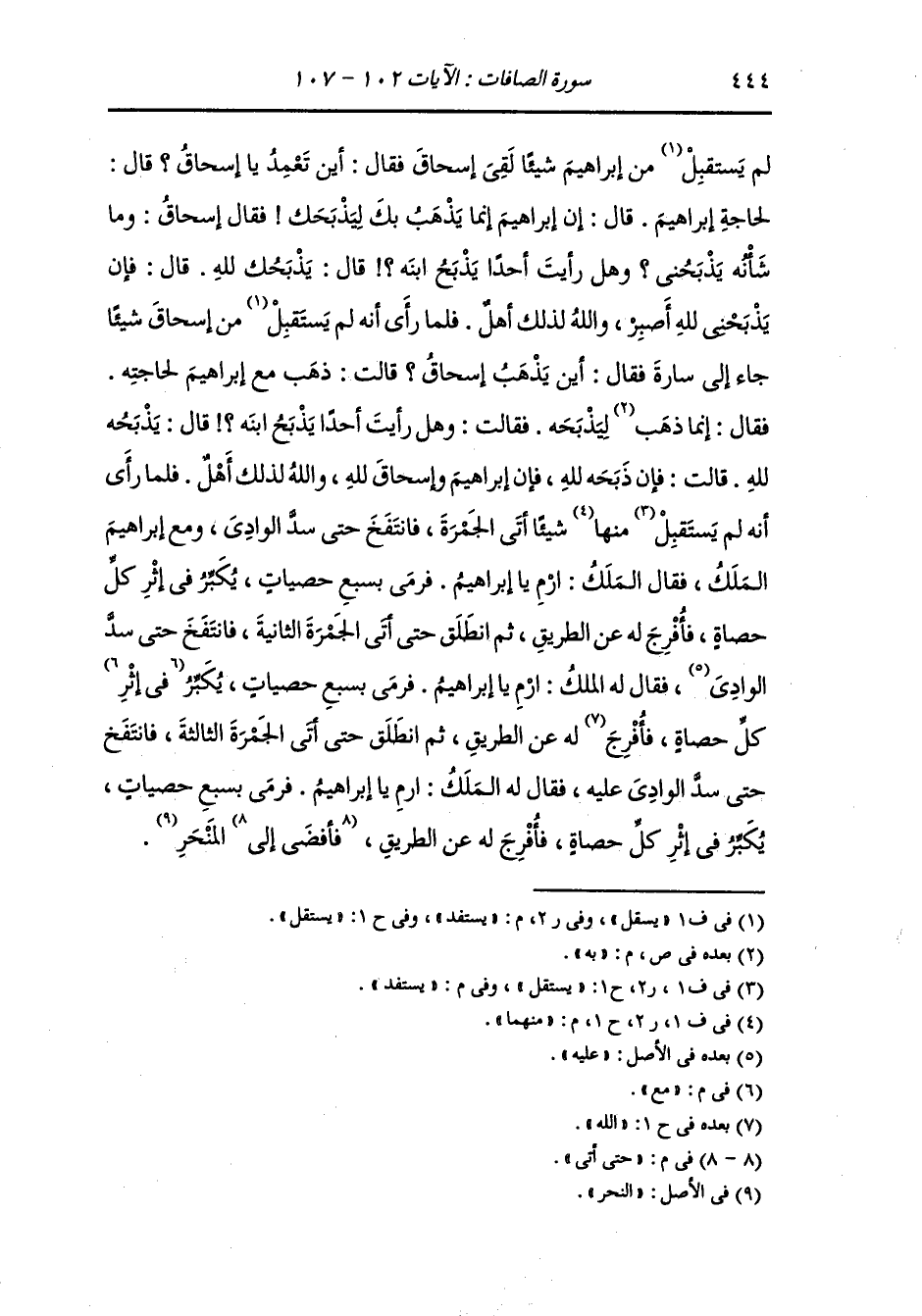 حتى لا أضطرب وأكفف عني ثيابك حتى لا ينضح عليها من دمي شيء فتراه سارة فتحزن وأسرع مر السكين على حلقي ليكون أهون للموت علي فإذا أتيت سارة فأقرأ عليها السلام مني ، فأقبل عليه إبراهيم بقلبه وهو يبكي وإسحاق يبكي ثم أنه جر السكين على حلقه فلم تنحر وضرب الله على حلق إسحاق صفيحة من نحاس فلما رأى ذلك ضرب به على جبينه وحز من قفاه ، وذلك قول الله {فلما أسلما} يقول : سلما لله الأمر {وتله للجبين} فنودي يا إبراهيم (قد صدقت الرؤيا) بإسحاق فالتفت فإذا هو بكبش فأخذه وحل عن ابنه وأكب عليه يقبله وجعل يقول : اليوم يا بني وهبت لي.