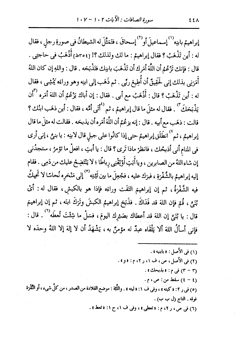 ترى} قال له إسحاق : يا أبت ربي أمرك قال إبراهيم : نعم يا إسحاق قال إسحاق : {افعل ما تؤمر ستجدني إن شاء الله من الصابرين فلما أسلما} لأمر الله {وتله} قال إسحاق لأبيه : يا أبت أوثقتني لأطيش بك نودي {يا إبراهيم قد صدقت الرؤيا} وهبط عليه الكبش من ثبير وقد قيل : إنه ارتعى في الجنة أربعين سنة فلما كشف عن إسحاق دعا ربه ورغب إليه وحمده وأوحى إليه : أن أدع فإن دعاءك مستجاب فقال : اللهم من خرج من الدنيا لا يشرك بك شيئا فأدخله الجنة ، قال ابن خاضر : إن إبراهيم كان قال لربه : يا رب أي ولدي أذبح فأوحى الرب إليه : أحبهما إليك.