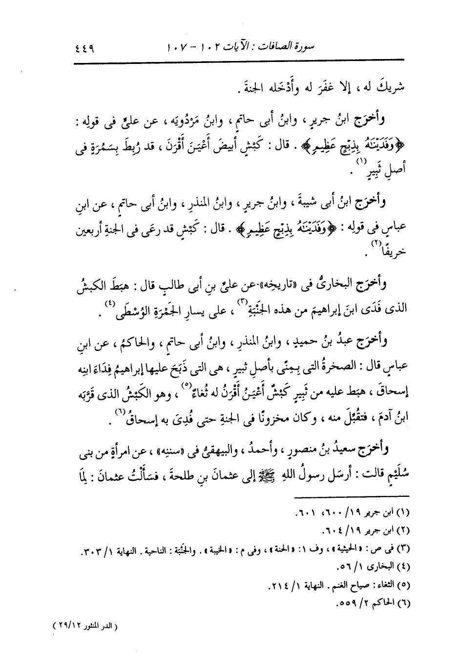 أذهب في حاجتي قال : فإنك تزعم أنك تذهب بابنك فتذبحه قال : والله إن كان الله أمرني بذلك إني لحقيق أن أطيع ربي ثم ذهب إلى ابنه وهو وراءه يمشي فقال له : أين تذهب قال : أذهب مع أبي فقال : إن أباك يزعم أن الله أمره بذبحك فقال له مثل ما قال إبراهيم ثم انطلق إبراهيم عليه السلام حتى إذا كانوا على جبل قال لابنه {يا بني إني أرى في المنام أني أذبحك فانظر ماذا ترى قال يا أبت افعل ما تؤمر ستجدني إن شاء الله من الصابرين} ويا أبت أوثقني رباطا لا ينتضح عليك من دمي فقام إليه إبراهيم بالشفرة فبرك عليه فجعل ما بين لبته إلى منحره نحاسا لا تحيك فيه الشفرة ثم إن إبراهيم التفت وراء فإذا هو بالكبش فقال له : أي بني قم فإن الله فداك فذبح إبراهيم الكبش وترك ابنه ثم إن إبراهيم عليه السلام قال : يا بني إن الله قد أعطاك بصبرك اليوم فسل ما شئت تعطى قال : فإني أسأل الله أن لا يلقاه له عبد مؤمن به يشهد أن لا إله إلا الله وحده