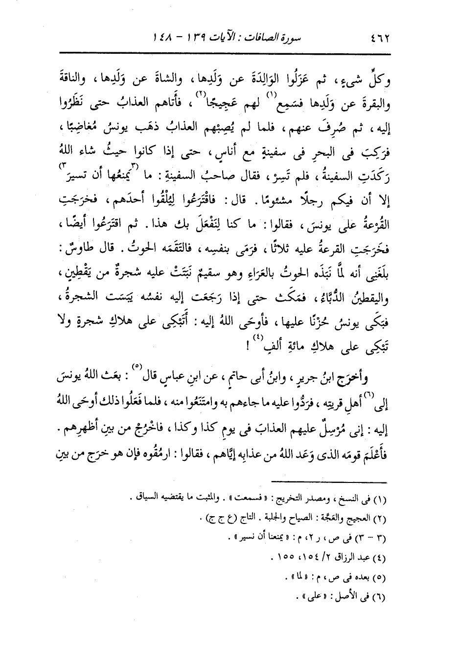 أَخرَج عَبد الرزاق وأحمد في الزهد ، وعَبد بن حُمَيد ، وَابن المنذر ، عَن طاووس في قوله {وإن يونس لمن المرسلين إذ أبق إلى الفلك المشحون} قال : قيل ليونس عليه السلام إن قومك يأتيهم العذاب يوم كذا وكذا ، فلما كان يومئذ خرج يونس عليه السلام ففقده قومه فخرجوا بالصغير والكبير والدواب