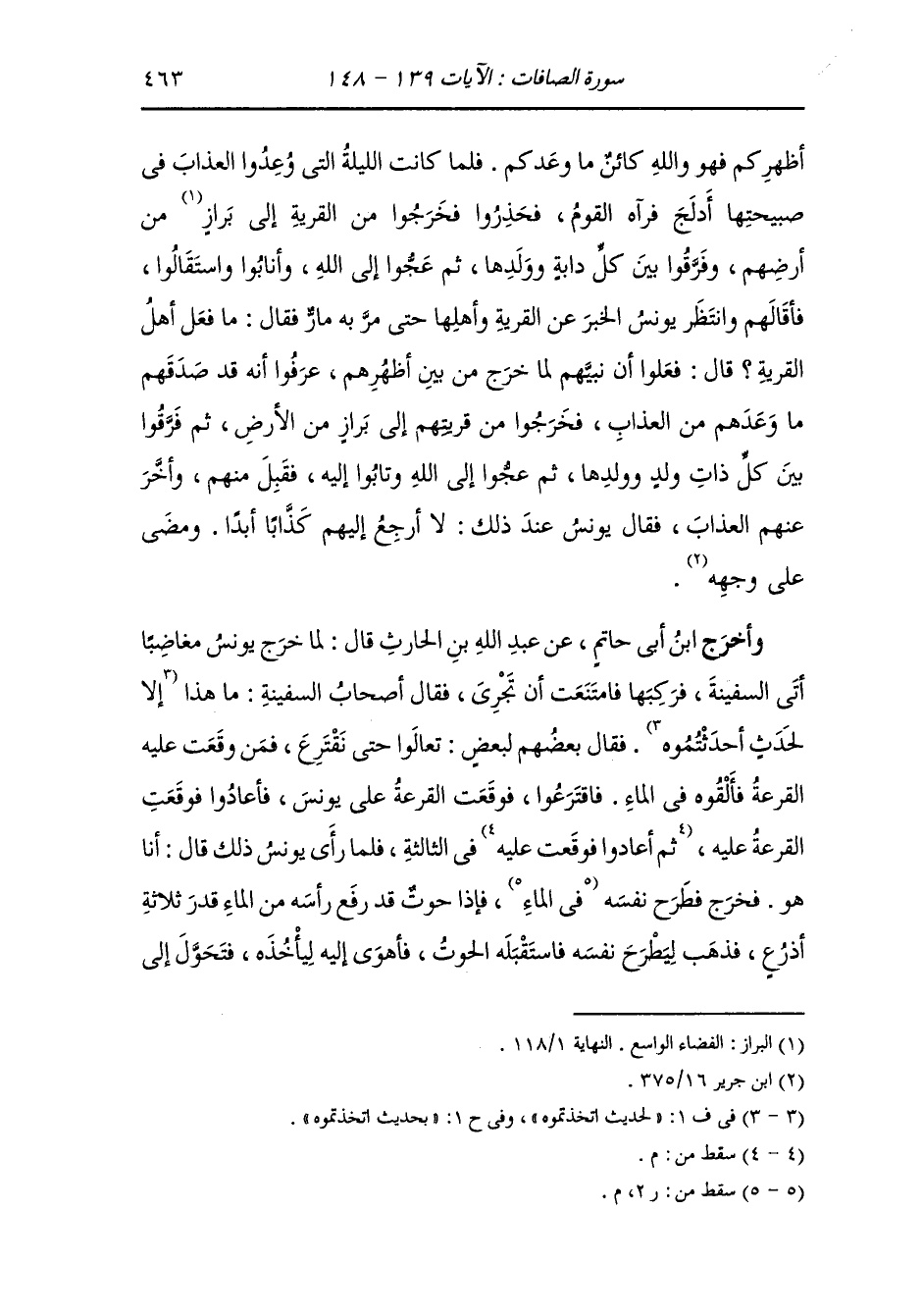وكل شيء ، ثم عزلوا الوالدة عن ولدها والشاة عن ولدها والناقة والبقرة عن ولدها فسمعت لهم عجيجا فأتاهم العذاب حتى نظروا إليه ثم صرف عنهم ، فلما لم يصبهم العذاب ذهب يونس عليه السلام مغاضبا فركب في البحر في سفينة مع أناس حتى إذا كانوا حيث شاء الله تعالى ركدت السفينة فلم تسر فقال صاحب السفينة : ما يمنعنا أن نسير إلا أن فيكم رجلا مشؤوما قال : فاقترعوا ليلقوا أحدهم فخرجت القرعة على يونس فقالوا : ما كنا لنفعل بك هذا ، ثم اقترعوا أيضا فخرجت القرعة عليه ثلاثا فرمى بنفسه فالتقمه الحوت قال طاووس : بلغني أنه لما نبذه الحوت بالعراء وهو سقيم نبتت عليه شجرة من يقطين واليقطين الدباء فمكث حتى إذا رجعت إليه نفسه يبست الشجرة فبكى يونس عليه السلام حزنا عليها فأوحى الله إليه : أتبكي على هلاك شجرة ولا تبكي على هلاك مائة ألف.