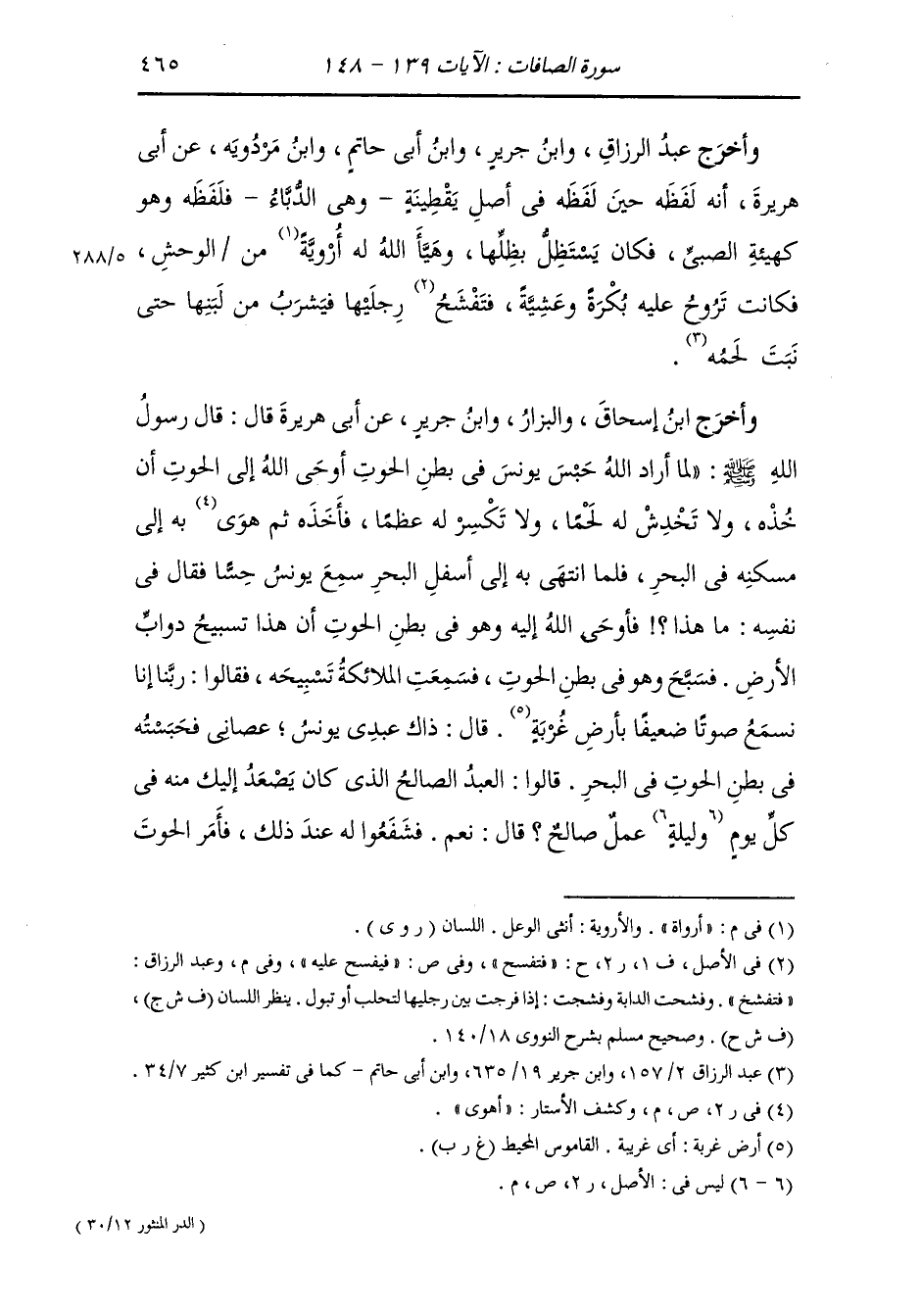 وأخرج عبد الرزاق ، وَابن جَرِير ، وَابن أبي حاتم ، وَابن مردويه عن أنس قال : قال رسول الله صلى الله عليه وسلم : لما ألقى يونس عليه سلام نفسه في البحر التقمه الحوت هوى به حتى انتهى إلى مفجر من الأرض أو كلمة تشبهها فسمع تسبيح الأرض (فنادى في الظلمات أن لا إله إلا أنت سبحانك إني كنت من الظالمين) (الأنبياء الآية 87) فأقبلت الدعوة تحوم العرش فقالت الملائكة : يا ربنا إنا نسمع صوتا ضعيفا من بلاد غربة قال : وتدرون ما ذا كم قالوا : لا يا ربنا قال : ذاك عبدي يونس قالوا : الذي كنا لا