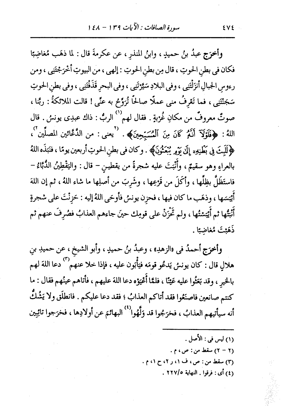 وأخرج عَبد بن حُمَيد ، وَابن جَرِير ، وَابن المنذر ، وَابن أبي حاتم عن قتادة رضي الله عنه قال {فالتقمه الحوت} يقال له نجم وإنه لبث ثلاثا في جوفه وفي قوله {فلولا أنه كان من المسبحين} قال : كان كثير الصلاة في الرخاء فنجا {للبث في بطنه} قال : لصار له بطن الحوت قبرا {إلى يوم يبعثون} قال : إلى يوم القيامة ، وفي قوله {فنبذناه بالعراء} قال : شط دجلة ، ونينوى على شط دجلة مكث في بطنه أربعين يوما يتردد به في دجلة.