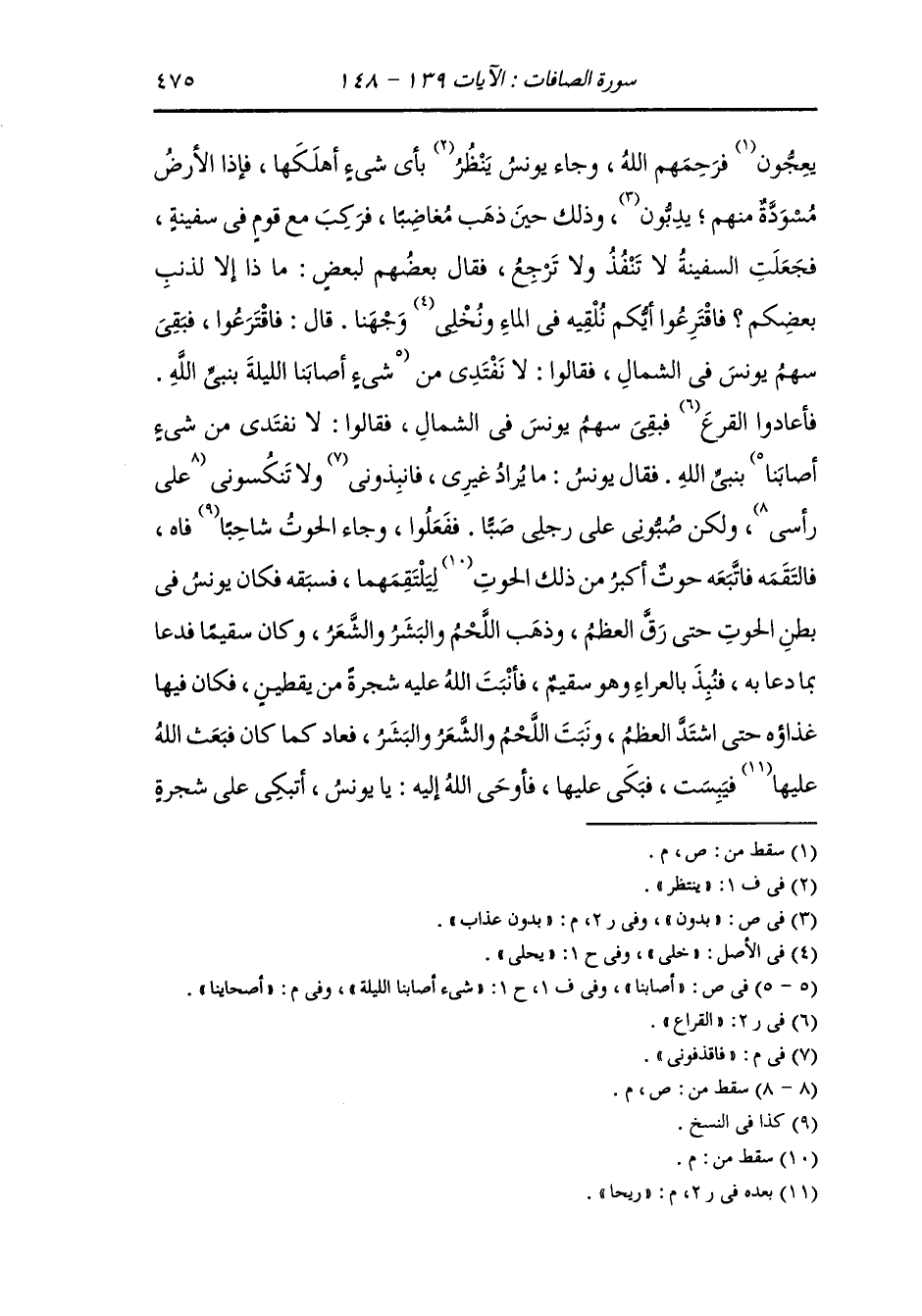 مغاضبا فكان في بطن الحوت قال من بطن الحوت : إلهي من البيوت أخرجتني ومن رؤوس الجبال أنزلتني وفي البلاد سيرتني وفي البحر قذفتني وفي بطن الحوت سجنتني فما تعرف مني عملا صالحا تروح به عني ، قالت الملائكة عليهم السلام : ربنا صوت معروف من مكان غربة فقال لهم الرب : ذاك عبدي يونس قال الله {فلولا أنه كان من المسبحين للبث في بطنه إلى يوم يبعثون} وكان في بطن الحوت أربعين يوما فنبذه الله {بالعراء وهو سقيم} وأنبت {عليه شجرة من يقطين} قال : اليقطين الدباء فاستظل بظلها وأكل من قرعها وشرب من أصلها ما شاء الله ، ثم أن الله تعالى أيبسها وذهب ما كان فيها فحزن يونس عليه السلام فأوحى الله إليه : حزنت على شجرة أنبتها ثم أيبستها ولم تحزن على قومك حين جاءهم العذاب فصرف عنهم ثم ذهبت مغاضبا.