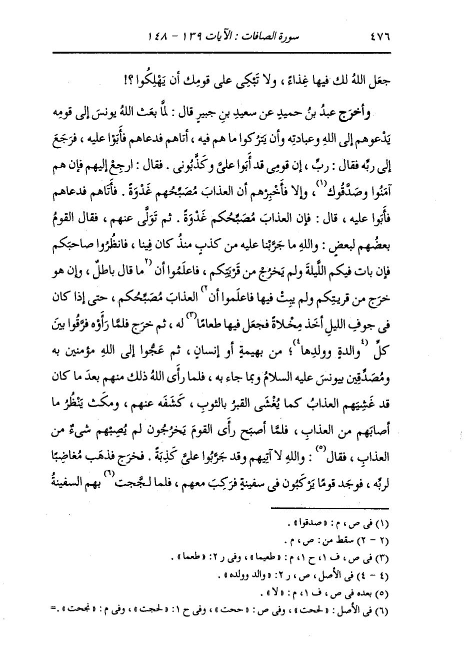 فرحمهم الله تعالى وجاء يونس عليه السلام ينظر بأي شيء أهلكها فإذا الأرض مسودة منهم بدون عذاب وذاك حين ذهب مغاضبا فركب مع قوم في سفينة فجعلت السفينة لا تنفذ ولا ترجع فقال بعضهم لبعض ماذا إلا لذنب بعضكم فاقترعوا أيكم نلقيه في الماء ونخلي وجهنا فاقترعوا فبقي سهم يونس عليه السلام في الشمال فقالوا : لا نفتدي من أصحابنا بنبي الله فقال يونس عليه السلام : ما يراد غيري فاقذفوني ولا تنكسوني ولكن صبوني على رجلي صبا ففعلوا وجاء الحوت شاحبا فاه فالتقمه فاتبعه حوت أكبر من ذلك ليلتقمهما فسبقه فكان يونس في بطن الحوت حتى رق العظم وذهب اللحم والبشر والشعر وكان سقيما فدعا بما دعا به فنبذ بالعراء وهو سقيم فأنبت الله {عليه شجرة من يقطين} فكان فيها غذاه حتى اشتد العظم ونبت اللحم والشعر والبشر فعاد كما كان فبعث الله عليها ريحا فيبست فبكى عليها فأوحى الله إليه يا يونس أتبكي على شجرة
