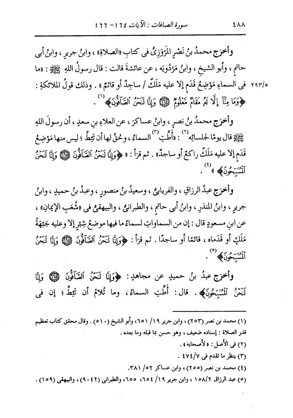 وأخرج أبو الشيخ في العظمة عن سعيد بن جبير رضي الله عنه {وما منا إلا له مقام معلوم} قال : الملائكة ، ما في السماء موضع إلا عليه ملك إما ساجدا أو قائما حتى تقوم الساعة.