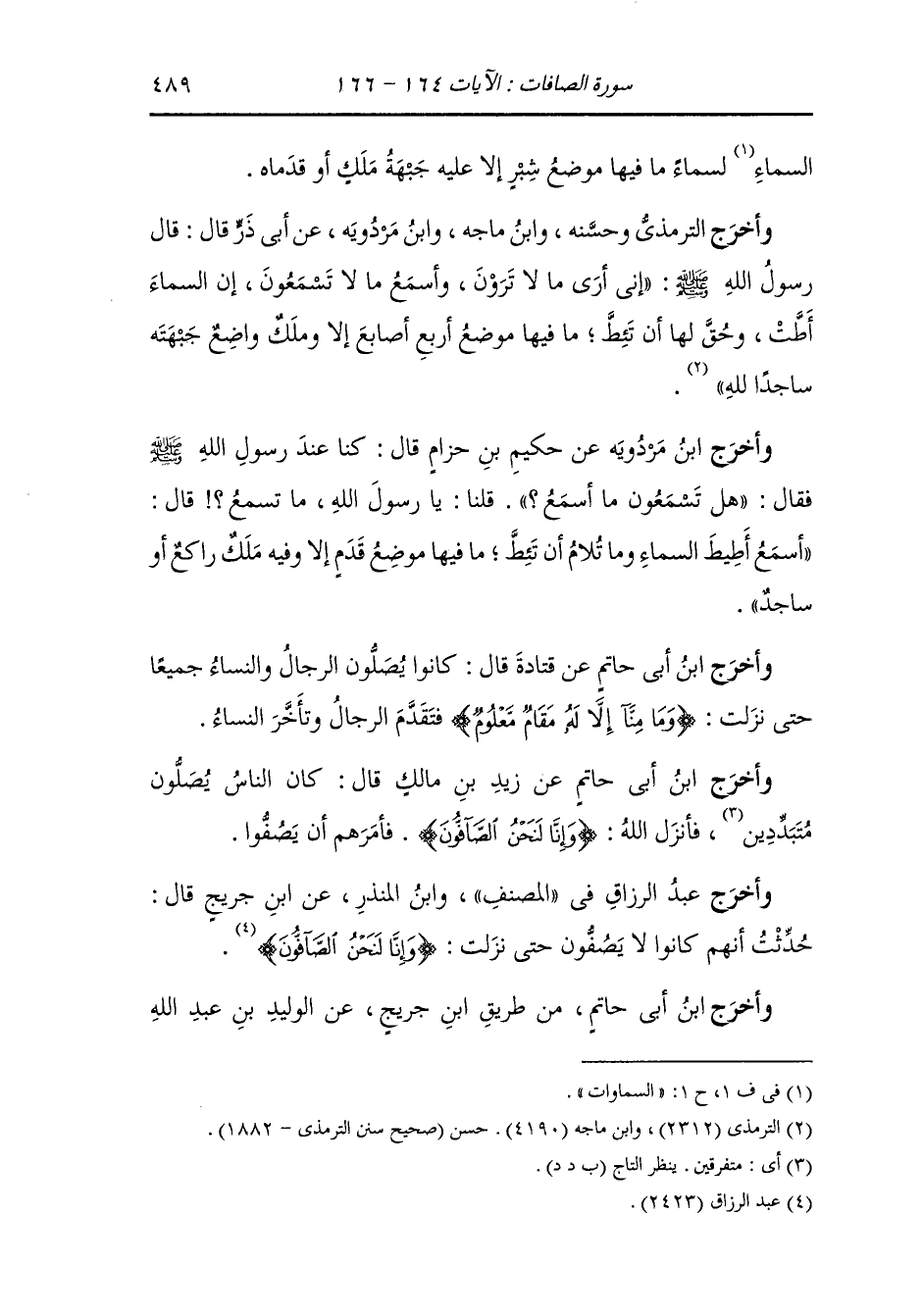 وأخرج محمد بن نصر المروزي في كتاب الصلاة ، وَابن جَرِير ، وَابن أبي حاتم وأبو الشيخ ، وَابن مردويه عن عائشة رضي الله عنها قالت : قال رسول الله صلى الله عليه وسلم : ما في السماء موضع قدم إلا عليه ملك ساجدا أو قائم وذلك قول الملائكة عليهم السلام {وما منا إلا له مقام معلوم وإنا لنحن الصافون}.