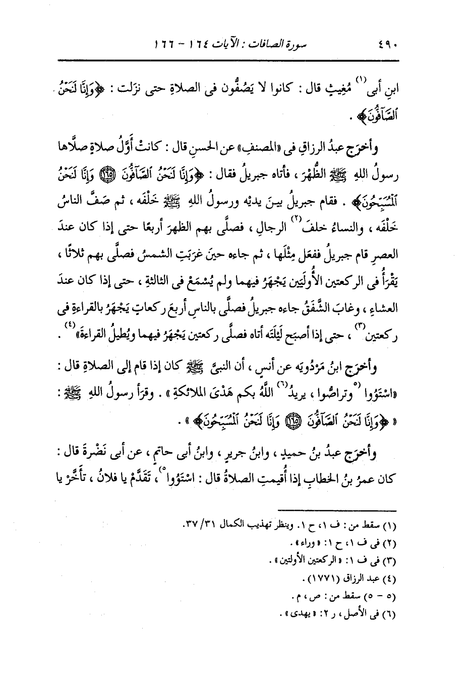 وأخرج ابن أبي حاتم عن زيد بن مالك رضي الله عنه قال : كان الناس يصلون متبددين فأنزل الله {وإنا لنحن الصافون} فأمرهم أن يصفوا.