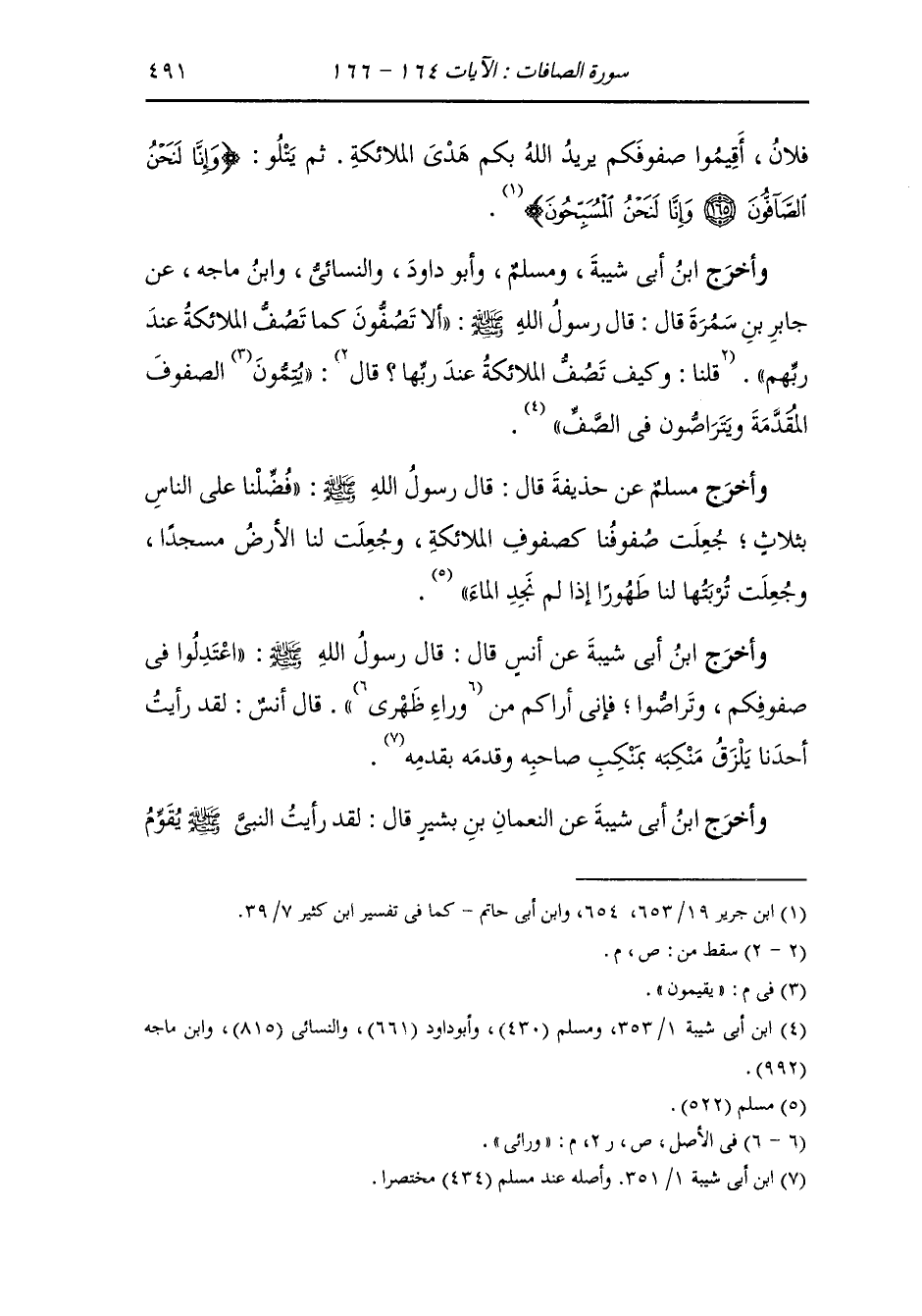 وأخرج ابن مردويه عن أنس رضي الله عنه ، أن النَّبِيّ صلى الله عليه وسلم كان إذا قام إلى الصلاة قال : استووا وتراصوا يريد الله بكم هدى الملائكة " وقرأ رسول الله صلى الله عليه وسلم (وإنا لنحن الصافون ، وإنا لنحن المسبحون) ..