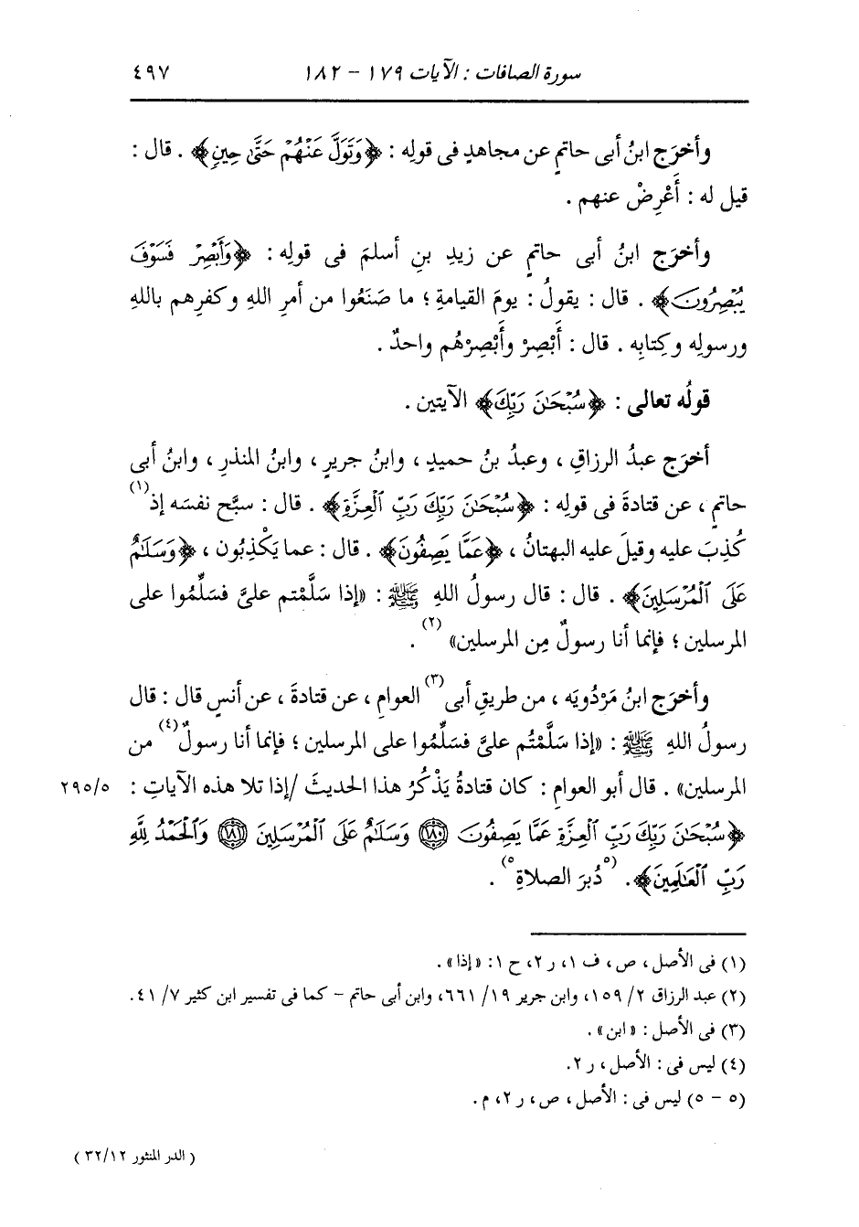 وأخرج ابن جرير ، وَابن أبي حاتم عن السدي رضي الله عنه في قوله {فتول عنهم حتى حين} قال : يوم بدر ، وفي قوله {فإذا نزل بساحتهم} قال : بدارهم {فساء صباح المنذرين} قال : بئسما يصبحون.