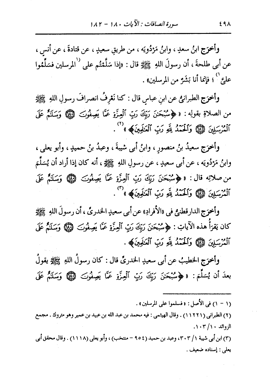 أَخرَج عَبد الرزاق ، وعَبد بن حُمَيد ، وَابن جَرِير ، وَابن المنذر ، وَابن أبي حاتم عن قتادة رضي الله عنه في قوله {سبحان ربك رب العزة} قال : يسبح نفسه إذ كذب عليه وقيل عليه البهتان {عما يصفون} قال : عما يكذبون {وسلام على المرسلين} قال : قال رسول الله صلى الله عليه وسلم : إذا سلمتم علي فسلموا على المرسلين فإنما أنا رسول من المرسلين.