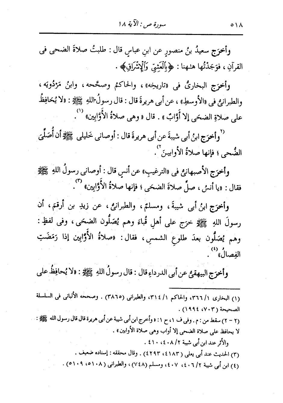 وأخرج ابن جرير والحاكم عن عبد الله بن الحارث عن ابن عباس رضي الله عنهما ، كان لا يصلي الضحى حتى أدخلناه على أم هانيء فقلنا لها : أخبري ابن عباس رضي الله عنهما بما أخبرتنا به ، فقالت : دخل رسول الله صلى الله عليه وسلم بيتي فصلى الضحى ثمان ركعات ، فخرج ابن عباس رضي الله عنهما وهو يقول : لقد قرأت ما بين اللوحين فما عرفت صلاة الإشراق إلا الساعة {يسبحن بالعشي والإشراق}.