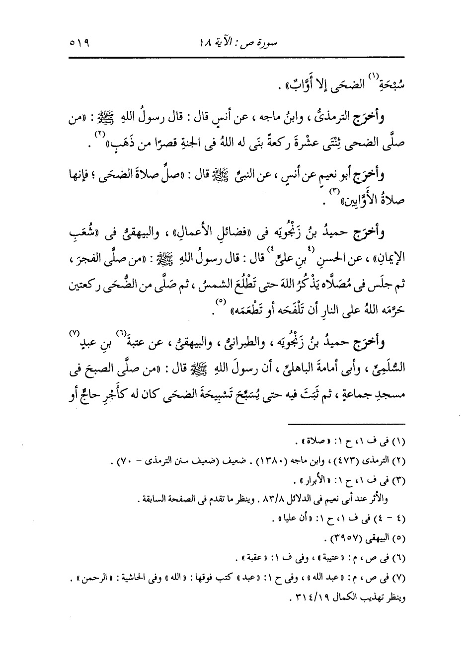 وأخرج البخاري في تاريخه والحاكم وصححه ، وَابن مردويه والطبراني في الأوسط عن أبي هريرة رضي الله عنه قال : قال رسول الله صلى الله عليه وسلم : لا يحافظ على صلاة الضحى إلا أواب هي صلاة الأوابين.