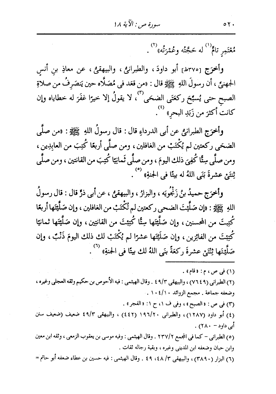 وأخرج حميد بن زنجويه والطبراني والبيهقي عن عتيبة بن عبد الله السلمي وأبي أمامة الباهلي أن رسول الله صلى الله عليه وسلم قال : من صلى الصبح في مسجد جماعة ثم ثبت فيه حتى يسبح تسبيحة الضحى كان له كأجر حاج أو